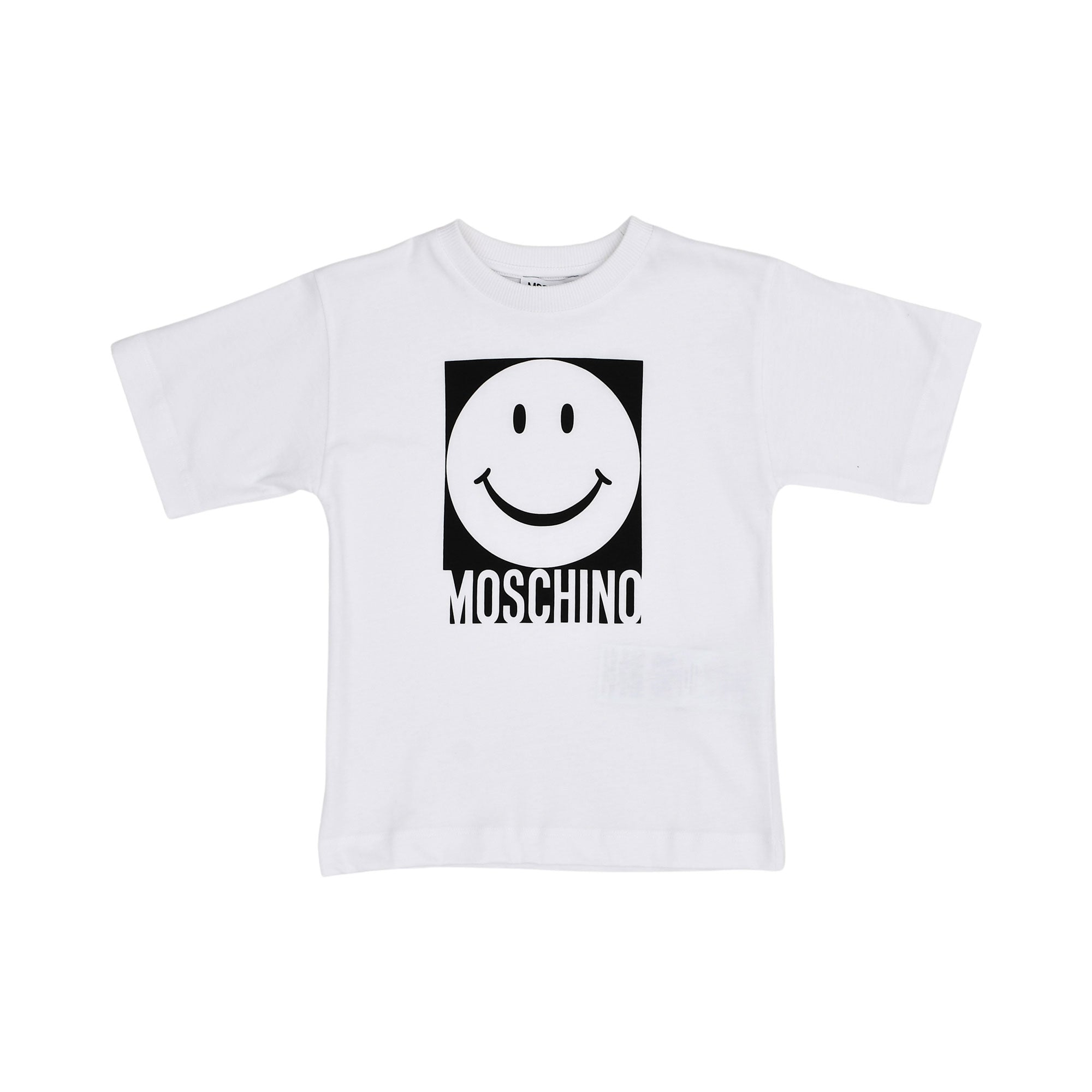 The Moschino Kids Boy's White T-Shirt is a stylish and playful piece, perfect for adding a cheerful touch to any young wardrobe. Crafted from soft, comfortable cotton, this t-shirt features a classic crew neck and short sleeves, making it ideal for everyday wear. The crisp white background is brought to life with a bold smiley face motif that spreads positivity, while the iconic Moschino logo print adds a touch of designer flair. Combining high-quality materials with fun, eye-catching design elements, this t-shirt effortlessly balances comfort and unmistakable Moschino style for boys.