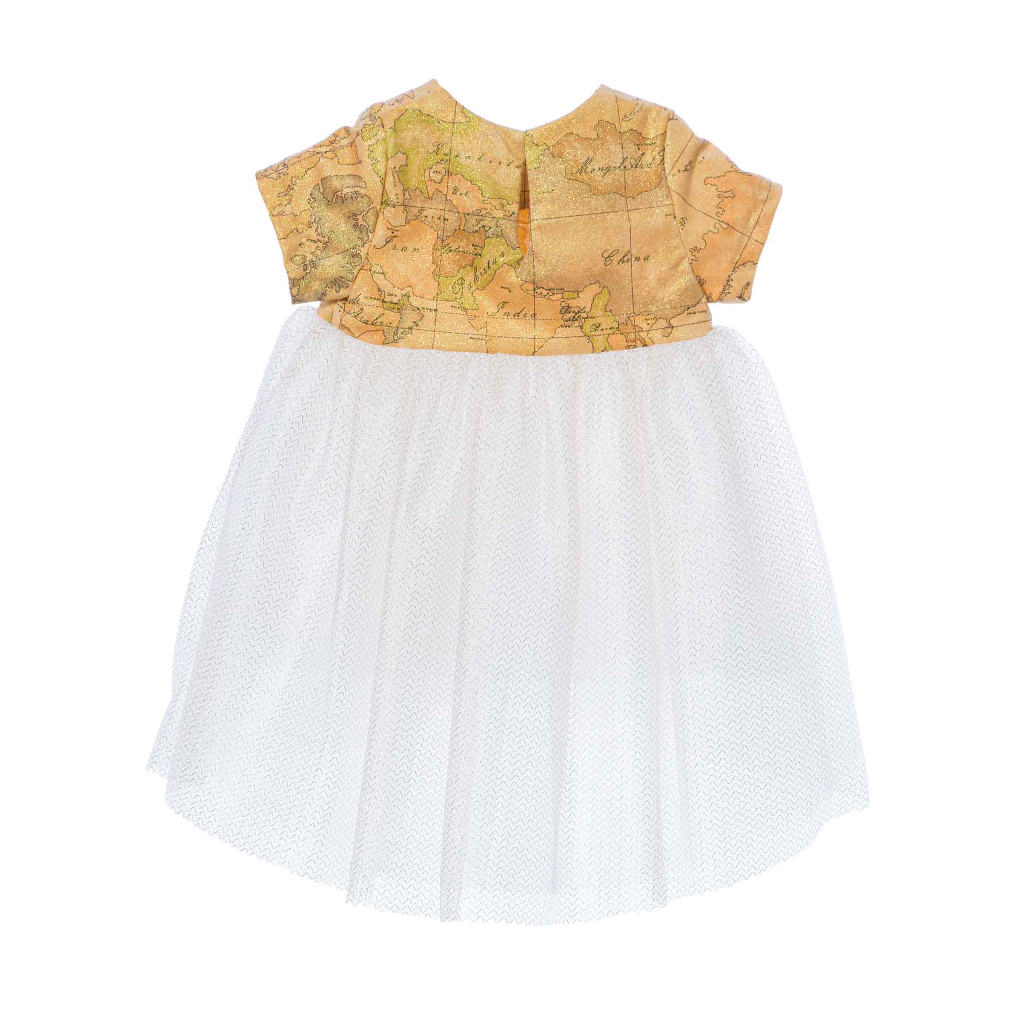 Your little one will be the envy of every occasion in the Alviero Martini Kids Girls' Geo Beige Lurex Dress. Featuring a round neck, short sleeves, and ruches at the waist, this dress flatters any figure. The geo map print at the upper waist adds a bit of fun flair. The dress has a button fastening at the back and is lined for added comfort. Perfect for parties, special occasions, and everyday wear, this stylish dress will be a favorite for years to come. Complete the look with comfortable shoes and accessories to match. SPECIFICATIONS