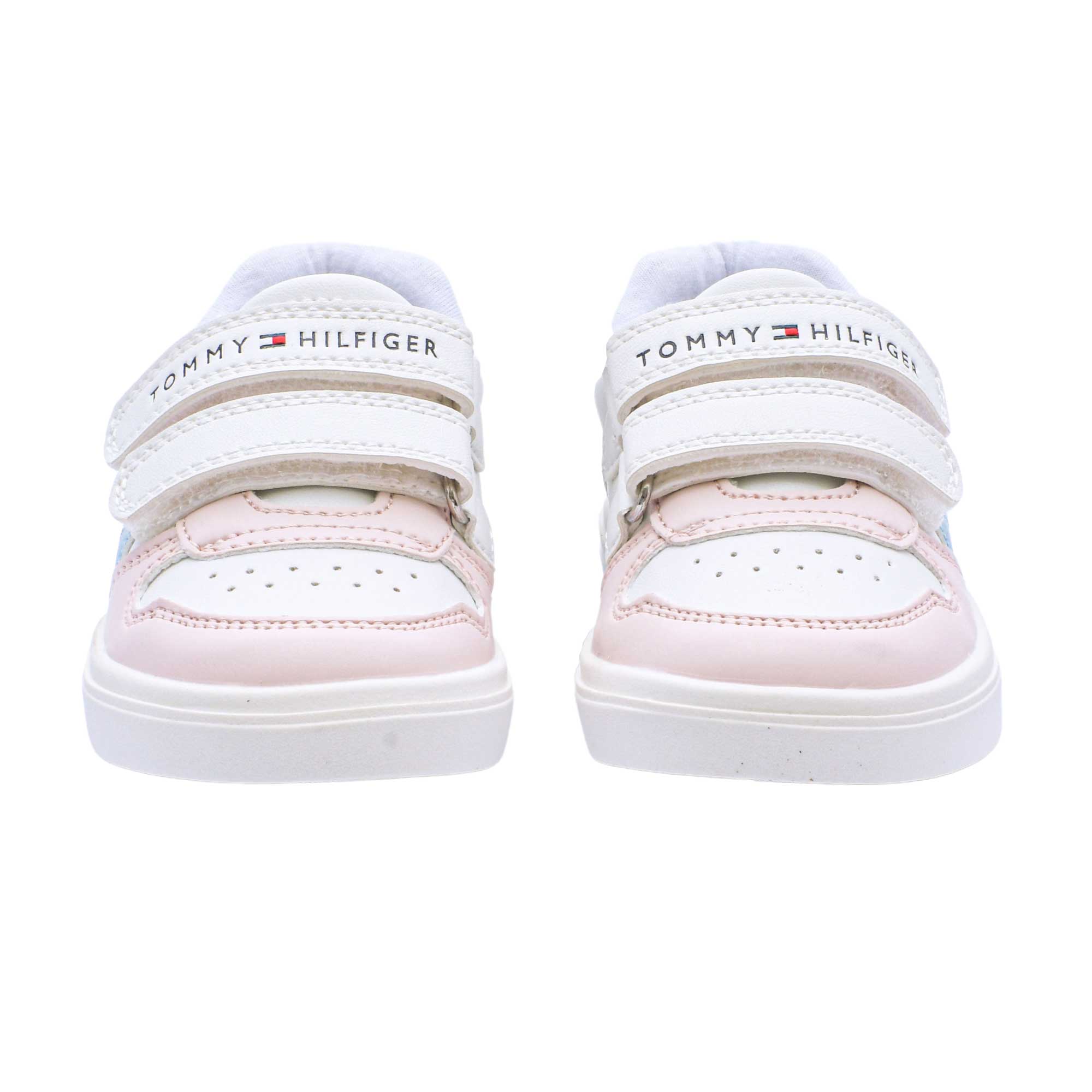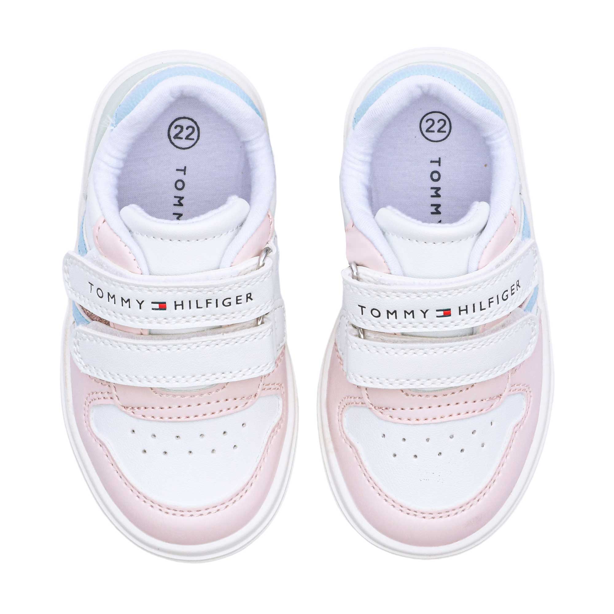 These White low-rise sneakers by Tommy Hilfiger are perfect for any little girl who loves to be stylish and on trend. The pastel pink, blue and green trims and glitter flag add a touch of sparkle and fun to her wardrobe. The velcro adjustable straps make it easy to get a comfortable fit and the one with logo branding adds a touch of designer flair. The textile lining is soft and comfortable and the non-slip rubber outer sole guarantees good grip on any surface. Best of all, these little sneakers are made with at least 50% recycled polyester, so you can feel good about being eco-friendly. Whether she’s playing at the park or out for a family walk, these White low-rise sneakers by Tommy Hilfiger will keep your little one looking and feeling good. SPECIFICATIONS: