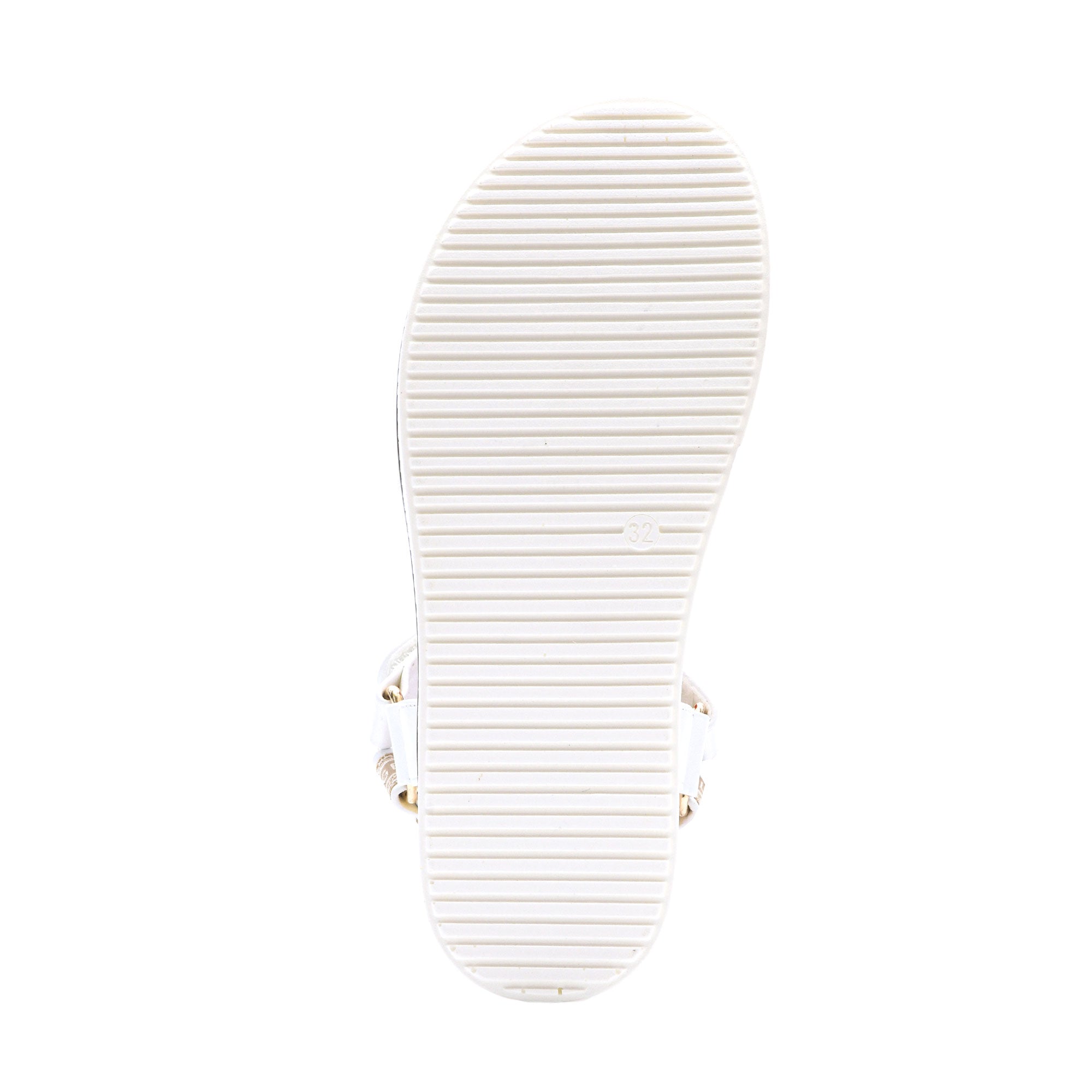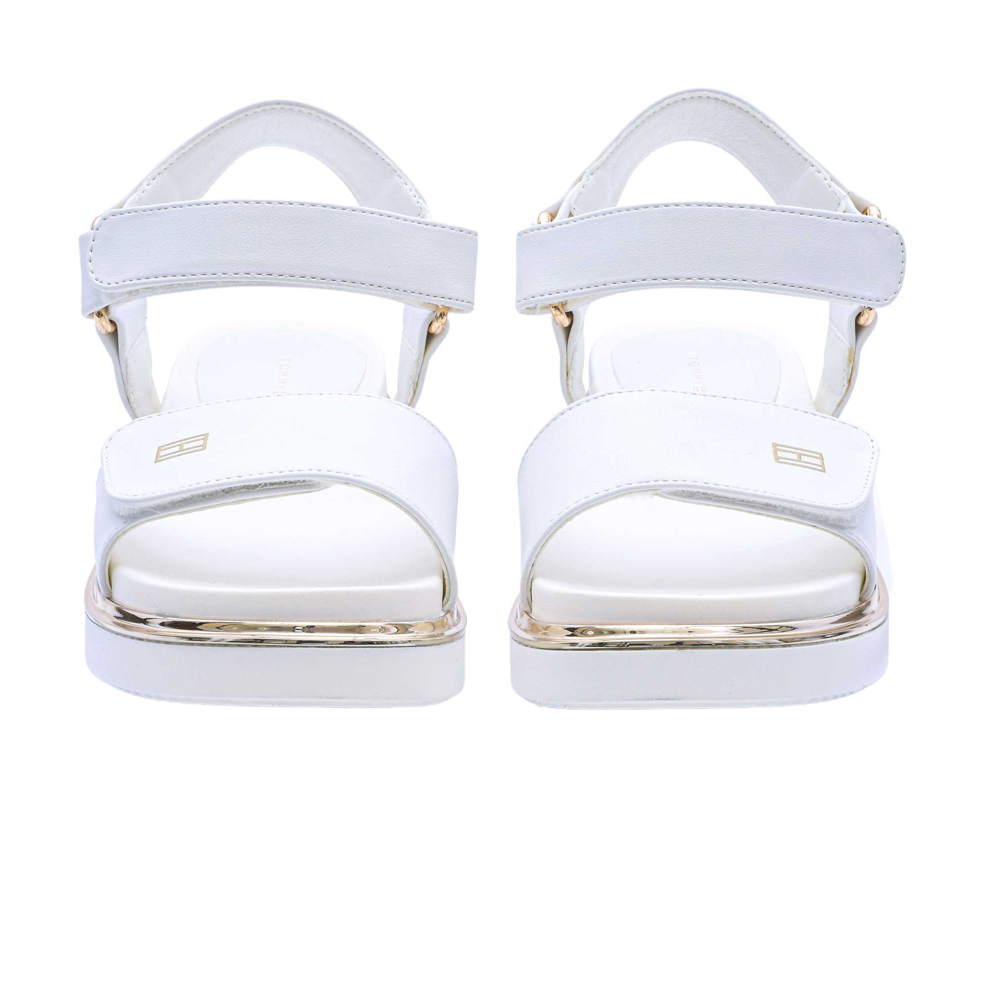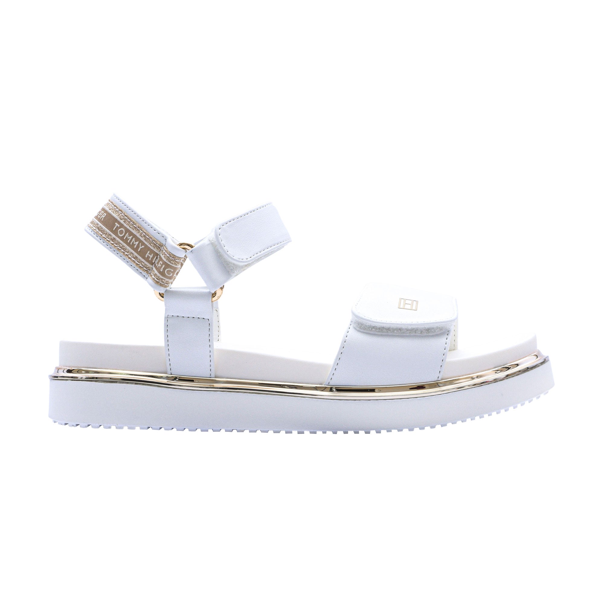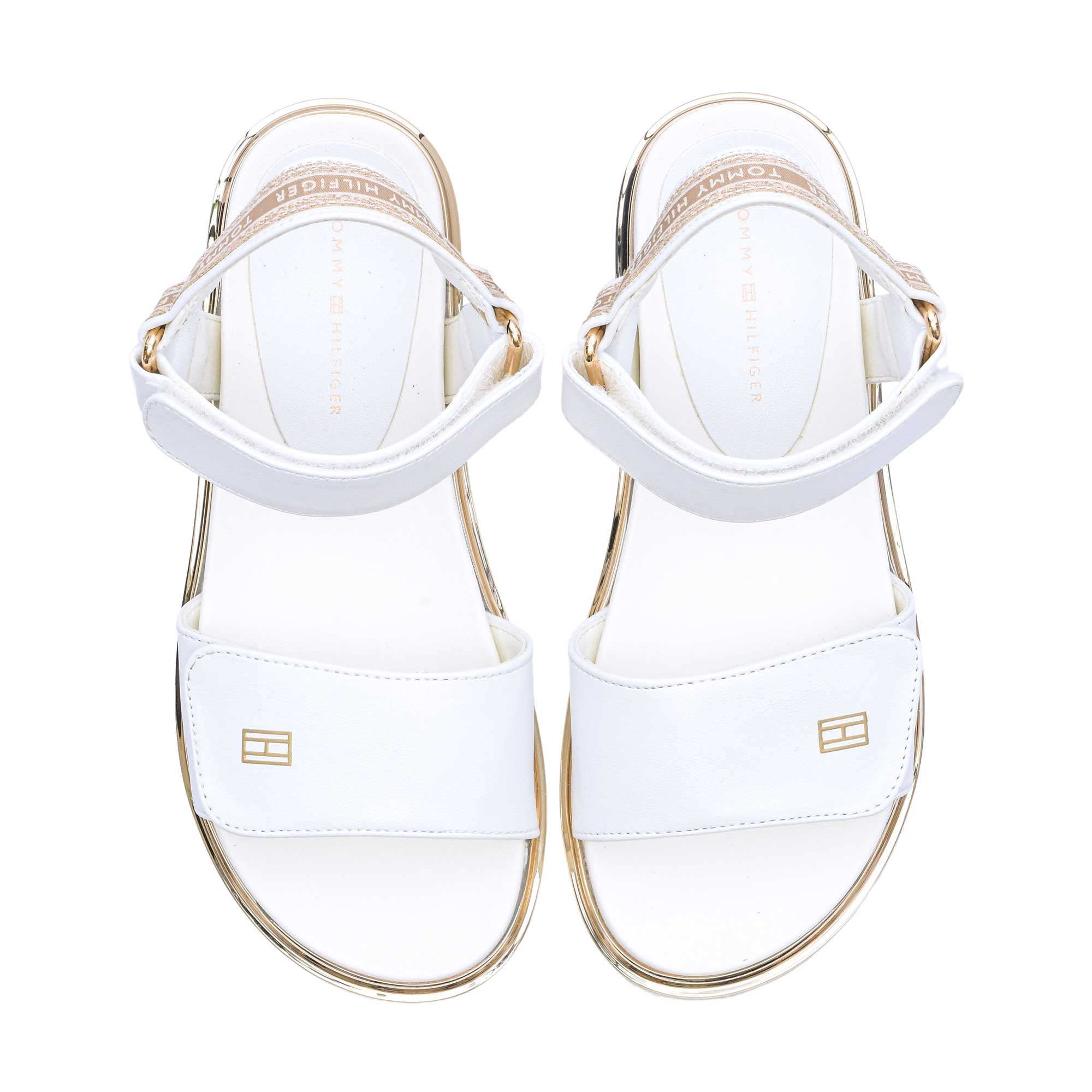 These stylish sandals by Tommy Hilfiger are the perfect addition to any girl’s wardrobe. Featuring a white faux leather upper and glamorous patent gold trims around the soles, these shoes are both stylish and durable. The heel strap is printed with logo tape and the front strap features an elegant gold flag logo for a designer touch. The velcro straps ensure a secure, comfortable fit. The non-slip rubber outer sole improves grip underfoot, making these sandals ideal for everyday wear. Whether you’re heading out for an afternoon of shopping or an evening of fun, these sandals will keep your little one looking stylish and feeling comfortable. SPECIFICATIONS: