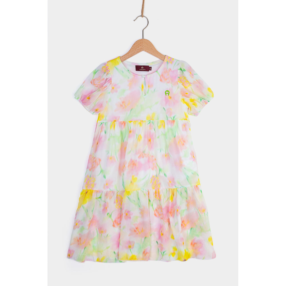 This beautiful white dress with a colourful floral pattern from AIGNER is perfect for teen girls who want to make a statement. Made from lightweight chiffon, this dress is easy and comfortable to wear. The bodice of the dress is printed with a floral motif and the brand's signature 'A' horseshoe logo, making it a truly designer piece. The dress is lined in lightweight cotton for comfort and fastens with branded buttons down the front. The dress has a round neck and puffed sleeves for a stylish, yet comfortable look. This dress is sure to make an impact, whether it's for a special occasion or for everyday wear. SPECIFICATIONS: