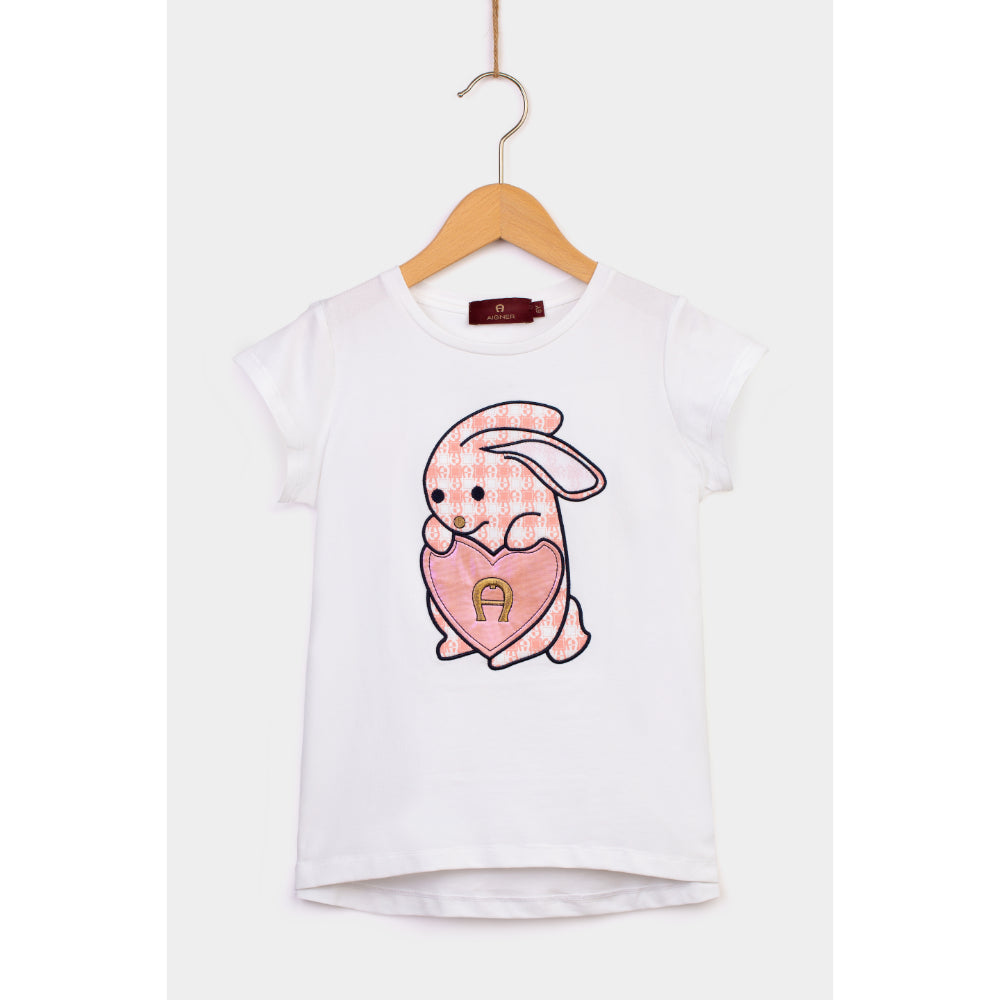 The White T-Shirt for Girls by German designer Aigner is a stylish and comfortable addition to any girl’s wardrobe. Crafted from soft cotton jersey in a unique white, this t-shirt features a round neck and short sleeves. Finishing off the design pink bunny and heart applique with the brands iconic horseshoe embroidered in gold on the front, offering a touch of sophistication. This t-shirt is perfect for any occasion, from school days to special outings. It is designed to be lightweight, breathable and comfortable, making it a great choice for warmer weather. Whether paired with jeans, shorts or skirts, this t-shirt from Aigner is sure to make a statement. With its classic design and quality craftsmanship, it will be a wardrobe staple for years to come. SPECIFICATIONS: