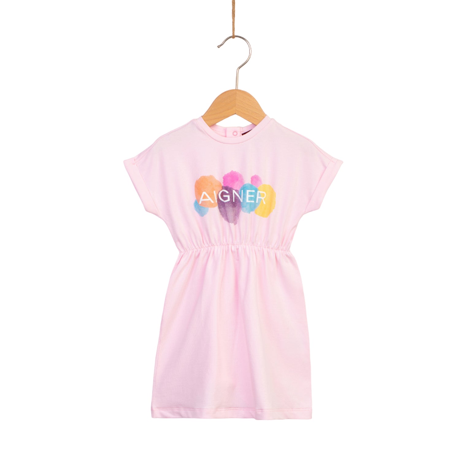 This pale pink dress by German brand AIGNER is perfect for little girls who need comfortable and stylish clothing. It is made from soft cotton jersey that is breathable and easy to wear, so your little one won't struggle to get dressed. The dress features an elasticated waist that provides extra comfort, a round neckline, turn-up cuffs and easy popper fastenings on the back for easy dressing. To finish, the dress is adorned with a colorful pastel motif and a white logo print on the front. This dress is perfect for days spent playing in the park, running around with friends or just relaxing at home. Its soft fabric will keep your little one comfortable, while the stylish design and eye-catching motifs will make her look and feel great. Whether it's paired with sandals or trainers, this dress will be sure to make your little one feel like a princess. SPECIFICATIONS: