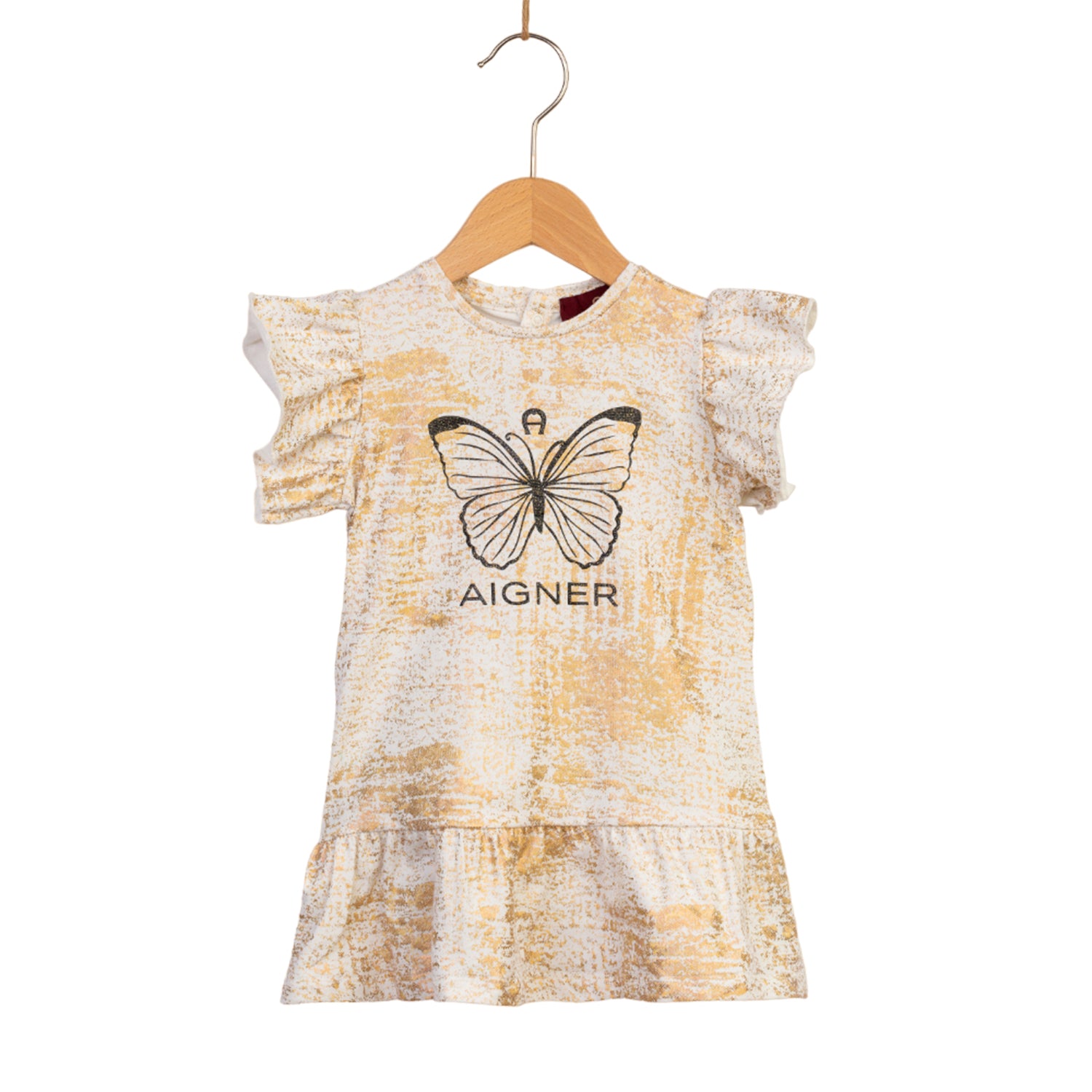 This gorgeous Ivory and Gold dress from German designer Aigner is perfect for little girls. It is made from soft cotton jersey and is adorned with a black glitter butterfly and the Aigner brand name on the front. The dress features ruffle detailing on the sleeves and hem, and fastens with poppers at the back for easy dressing. It is a beautiful piece for any special occasion and is sure to make your little one feel special. The ivory and gold color combination adds a touch of sophistication, making it a timeless and elegant piece. The dress is sure to become a favorite that can be worn over and over again.