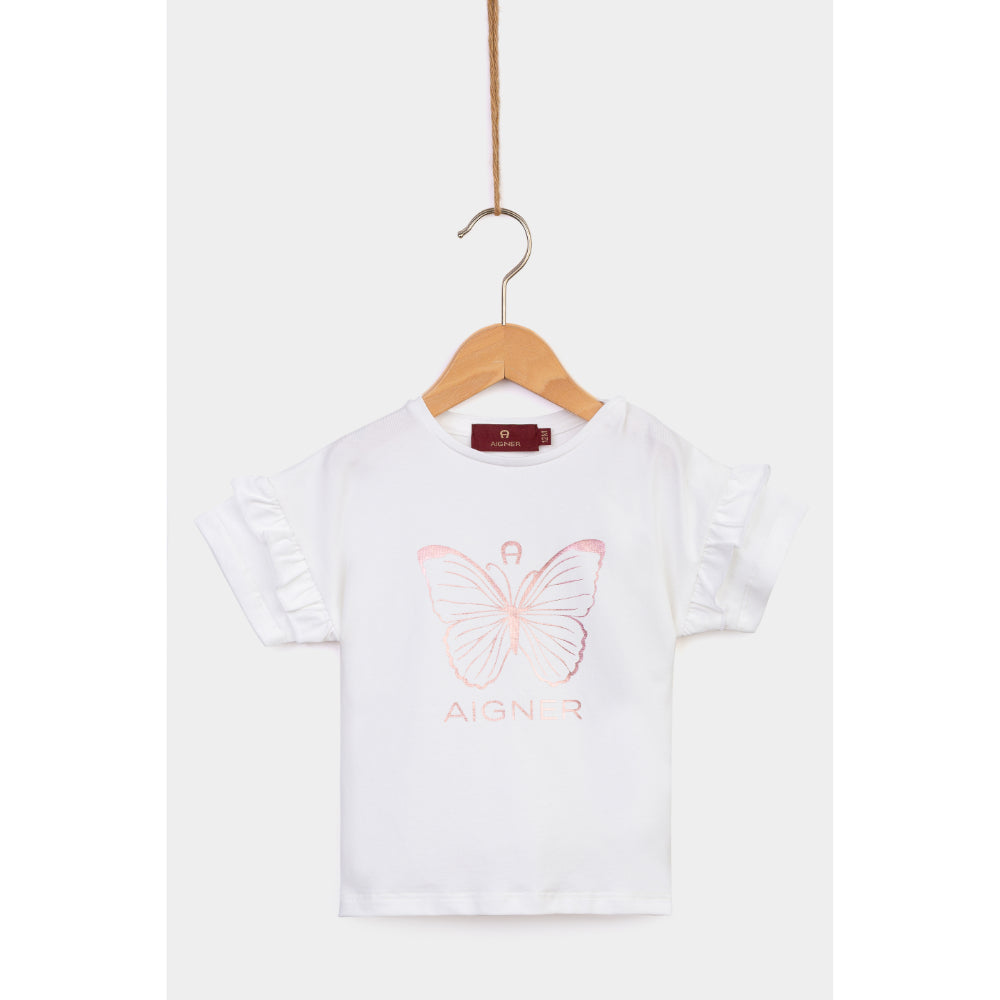 | This T-Shirt and skirt by German designer Aigner is perfect for any little girl's wardrobe. It is made of soft cotton fabric in a classic white and pink, making it the perfect choice for any special occasion. The round neck, straight hem and short ruffle sleeves provide a comfortable fit, while the butterfly and logo print in shiny gold foil on the chest adds a hint of glamour. It comes with tulle overlay skirt with elasticated waistband and brand repeated logo on waist. This stylish T-Shirt and skirt is sure to be a treasured item in any baby girl's wardrobe and is sure to make her look and feel like a princess. SPECIFICATIONS: