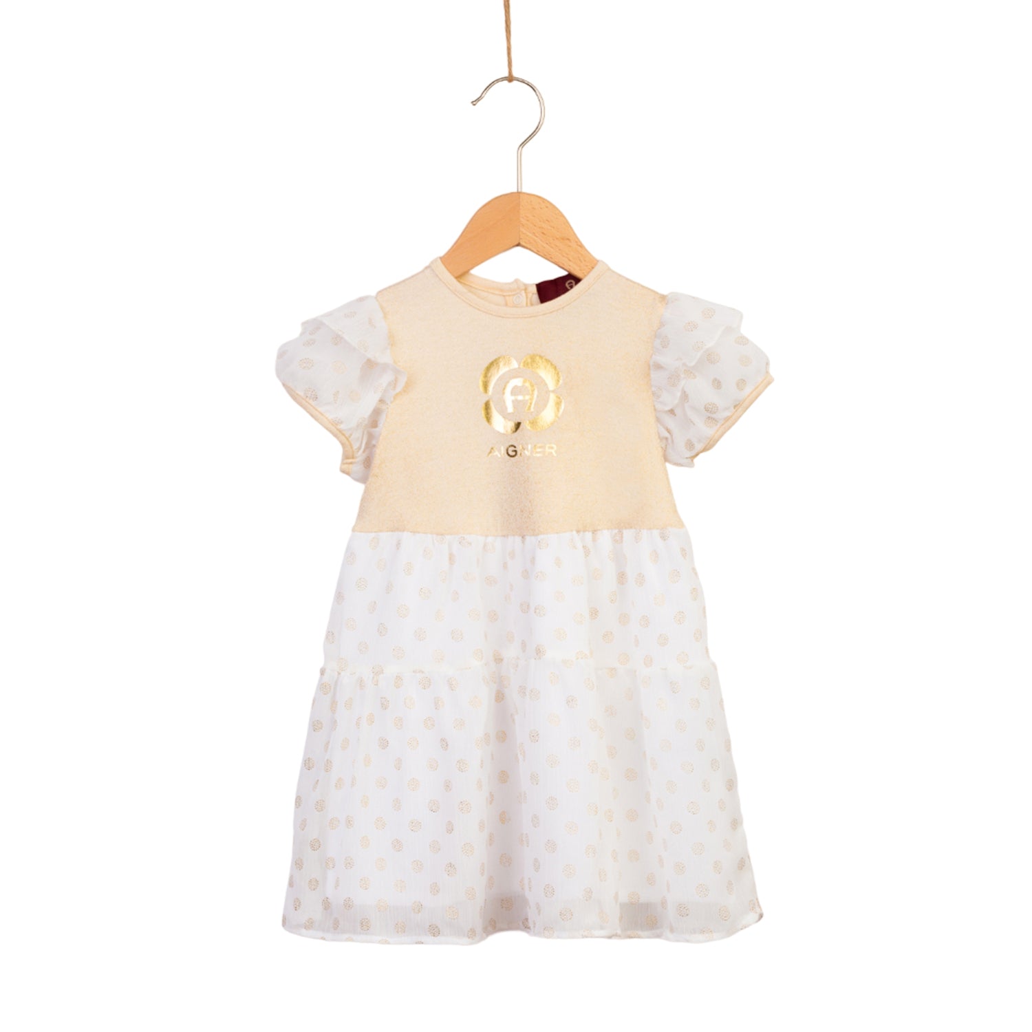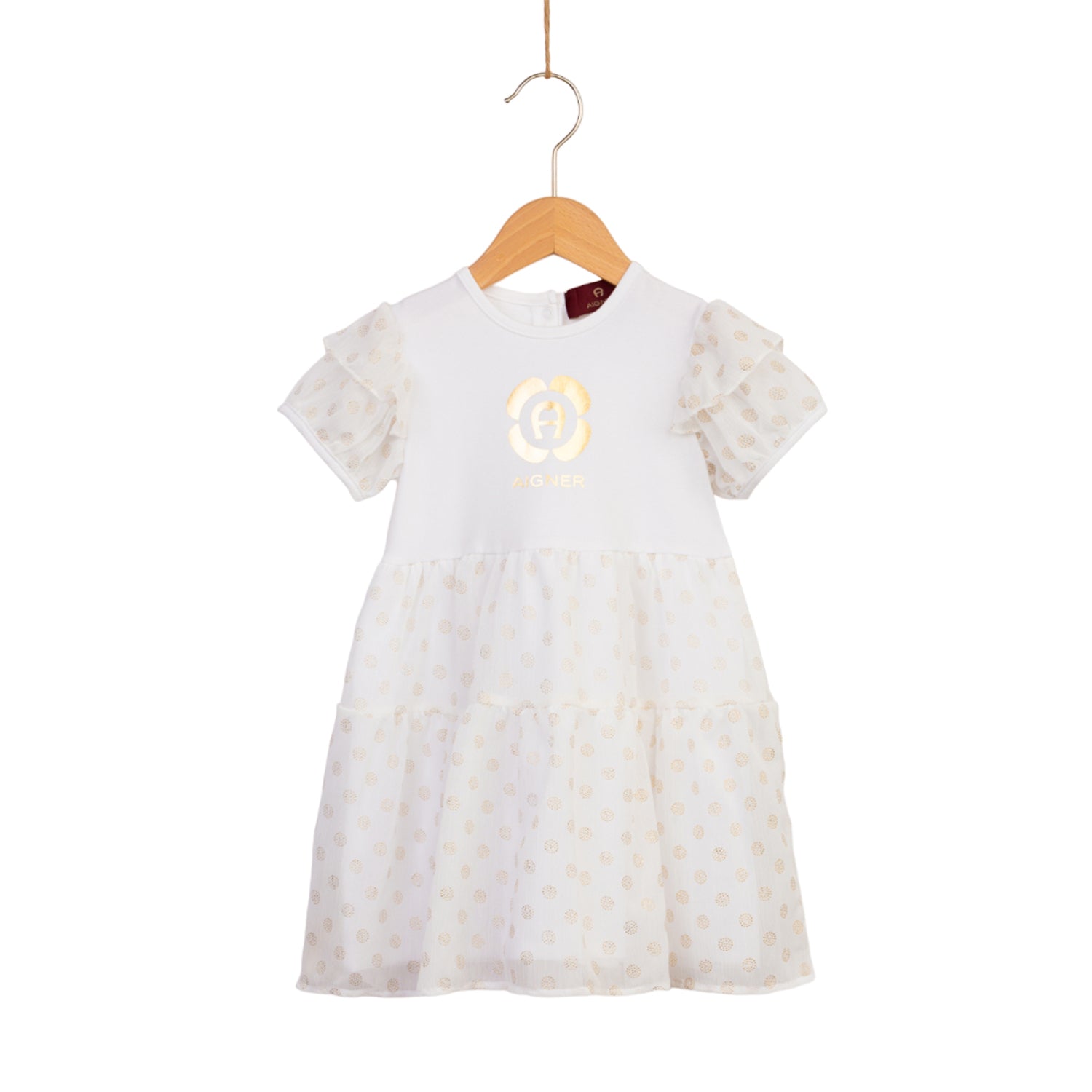 Dress for baby girls made of white and gold chiffon by German designer Aigner. The neck is round, and the sleeves are short. The top is crafted from comfortable cotton and decorated with a logo print in shiny gold foil on the chest and puffy chiffon sleeves with a polka dot pattern throughout. The skirt's matching gold polka dot chiffon is pleated into tiers and lined with cotton for comfort. Poppers provide for quick and easy access to the front and back.