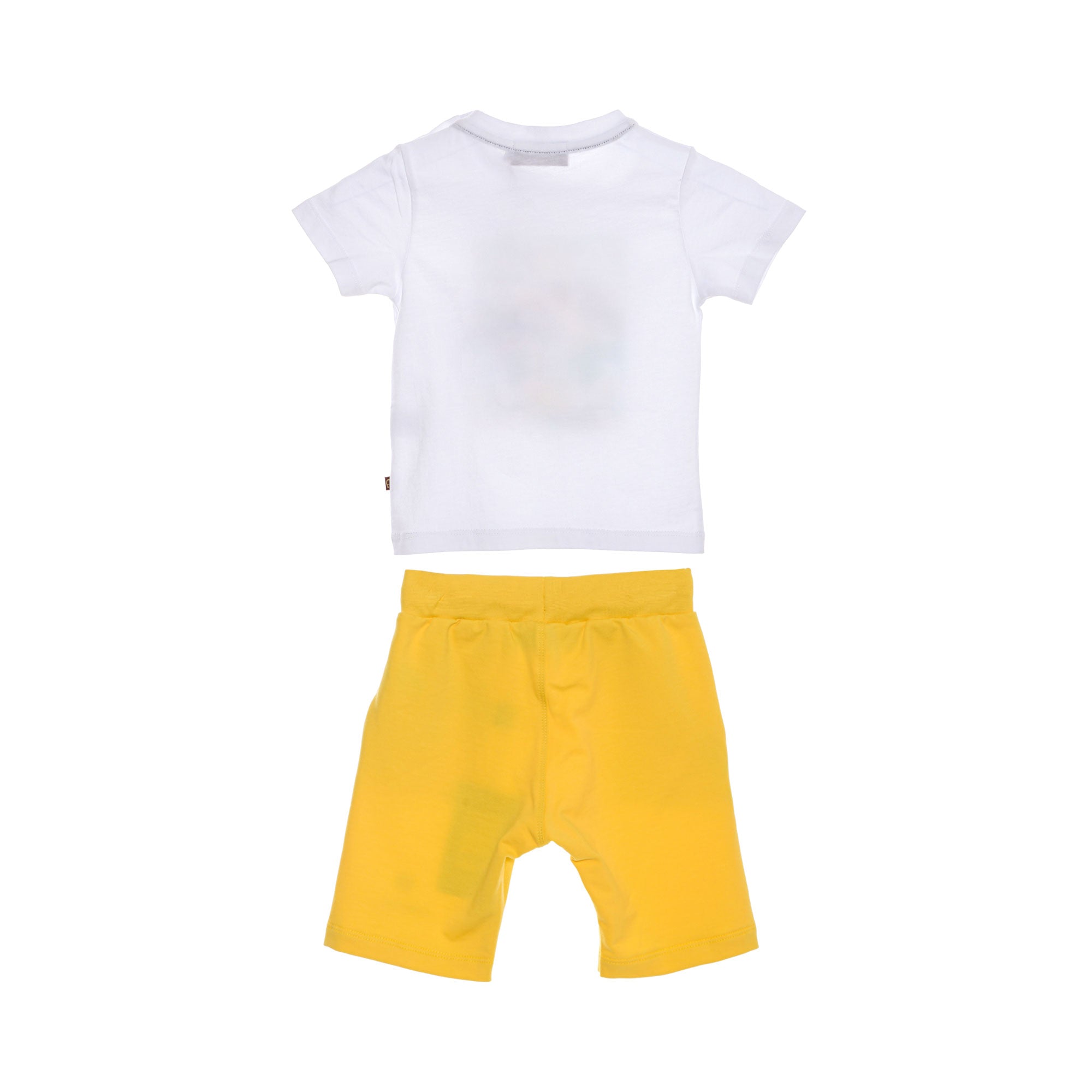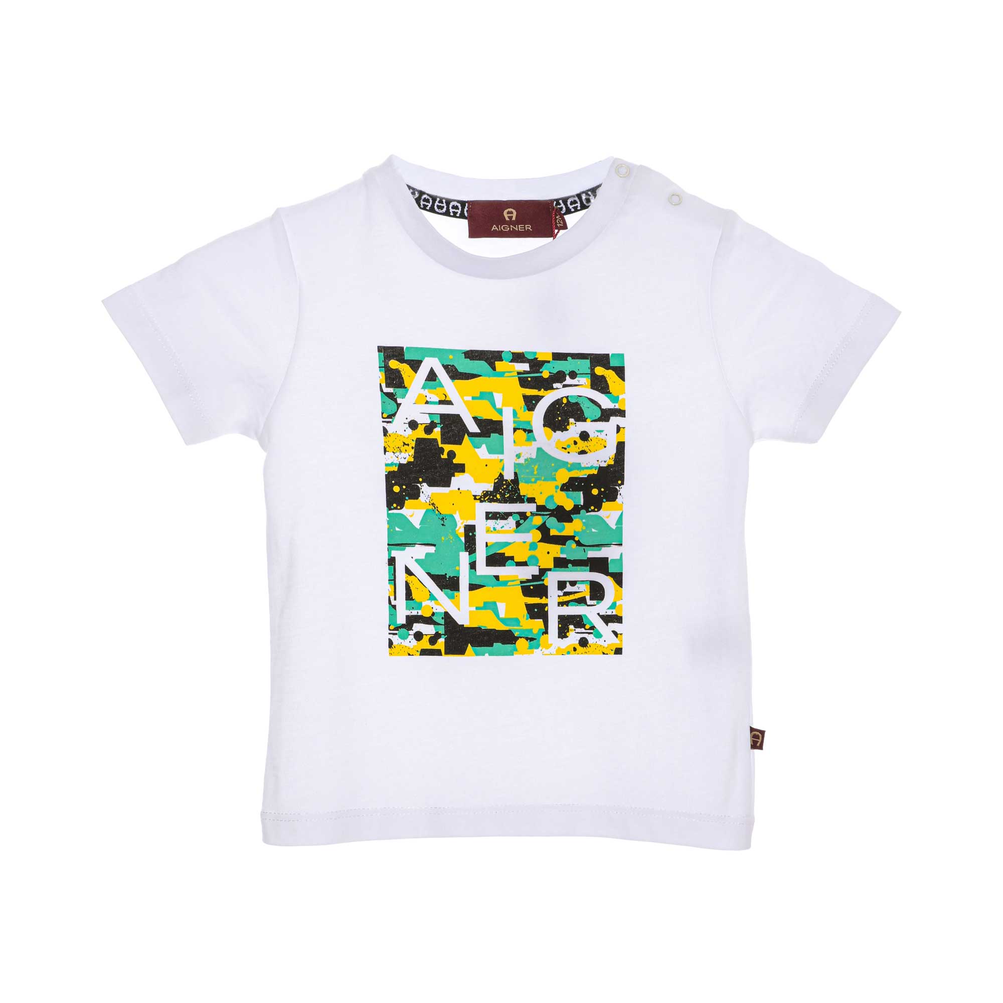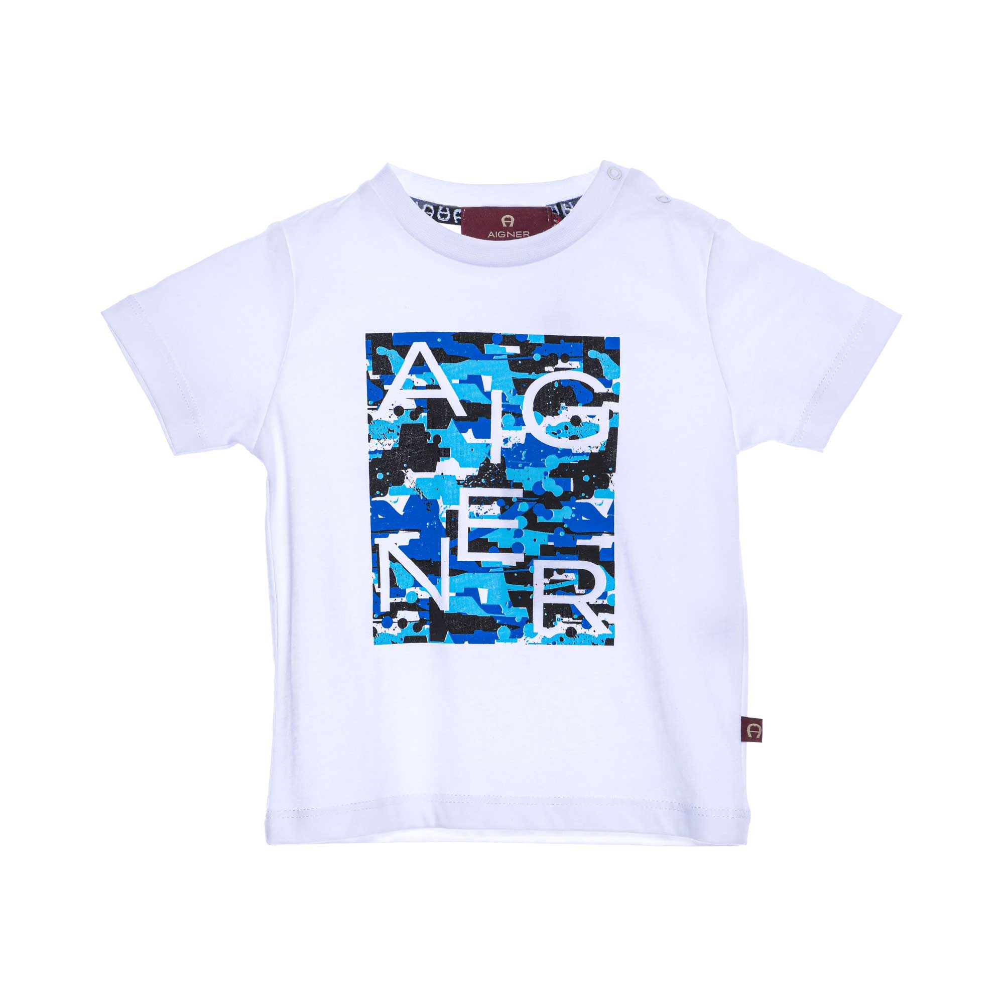 | This Boys' Aigner T-shirt and shorts outfit is perfect for a casual yet stylish look. The white t-shirt has a round neckline and short sleeves with a straight hem. It is made of breathable cotton and features an abstract print with the company logo in white over the chest. The elasticized waistband drawstring and matching pattern on the pockets of the shorts provide a comfortable fit. The company name and horseshoe logo are embroidered on one leg, adding a touch of style to the outfit. This outfit is great for everyday wear. SPECIFICATIONS: