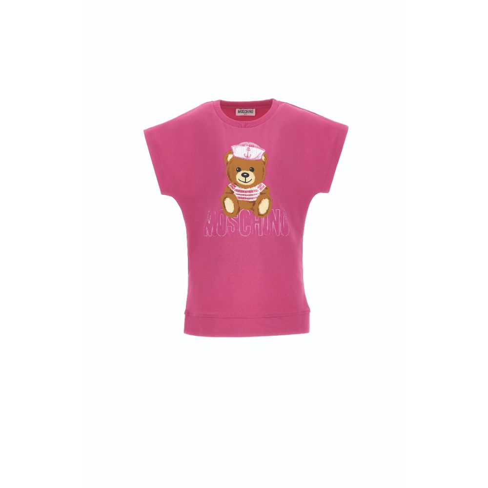The Moschino Kid Pink T-shirt for girls is the perfect combination of classic style and modern flair. This Pink t-shirt is made from a lightweight, breathable cotton blend, making it a comfortable choice for all-day wear. The simple design features a round neck, short sleeves and a straight hem and is finished with eye-catching beige Moschino Teddy Bear logo, wearing a shimmering pink and white, nautically-inspired sequinned hat on the front and wearing a cute pink and white striped sweater, with a outlined logo. This versatile t-shirt can be paired with jeans, shorts or chinos, making it perfect for any occasion.
