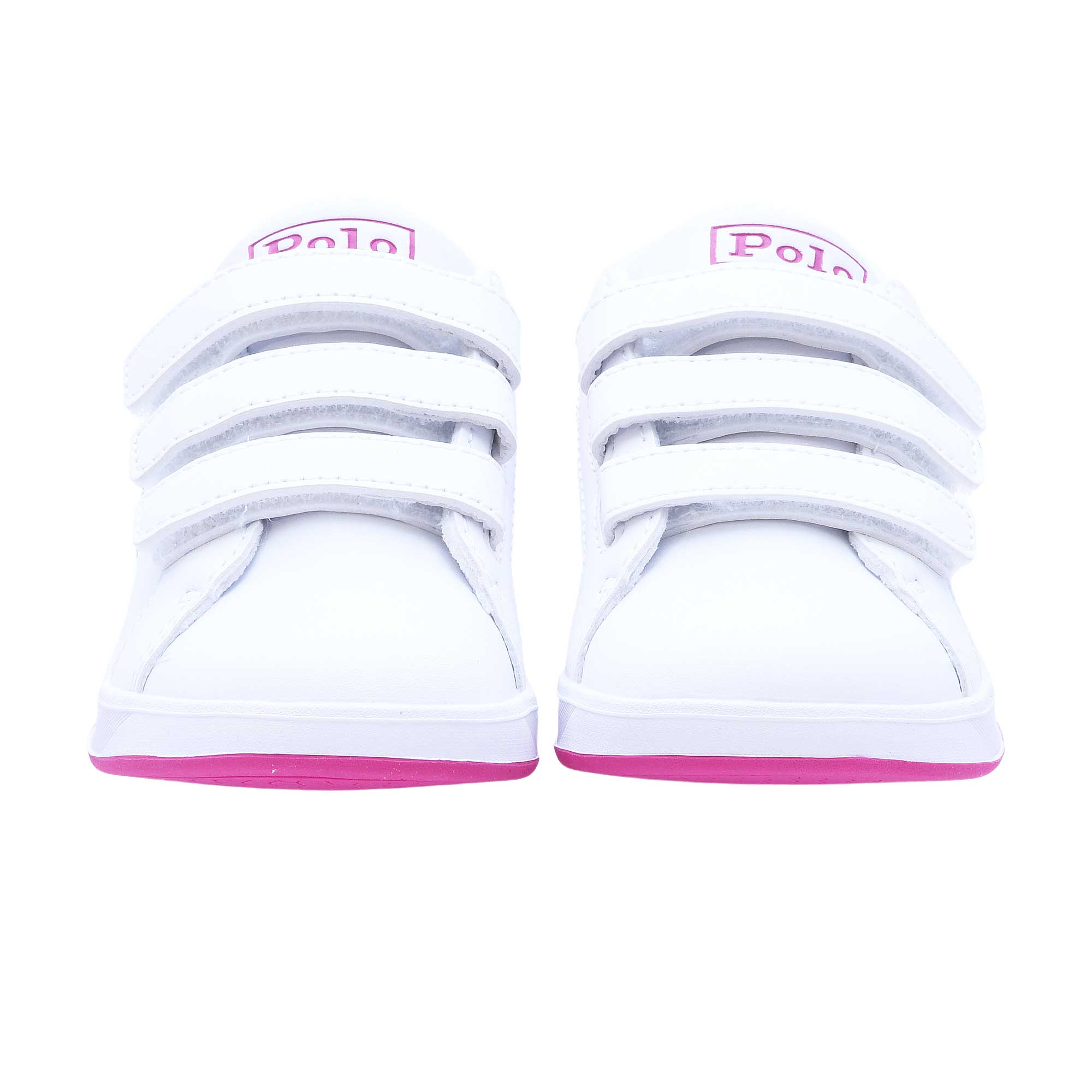 The Polo Ralph Lauren Kids Girl's white Sneakers are a stylish and comfortable choice for the little fashionista in your life. Perfect for any occasion, these white sneakers feature a soft leather construction and the iconic polo bear embroidered on the side for a signature touch. The printed logo on the tongue adds a pop of colour, while the embossed logo print at the back adds a subtle hint of style. The white insole and midsole, along with the pink non slip rubber outsole, provide a secure fit and plenty of cushioning. The vecro strap closure ensures a snug fit and easy on/off. Plus, the sneakers come in a branded box, making them a great gift idea. Little ones will love the classic look and comfortable fit of these Polo Ralph Lauren Kids Girl's white Sneakers. SPECIFICATIONS:
