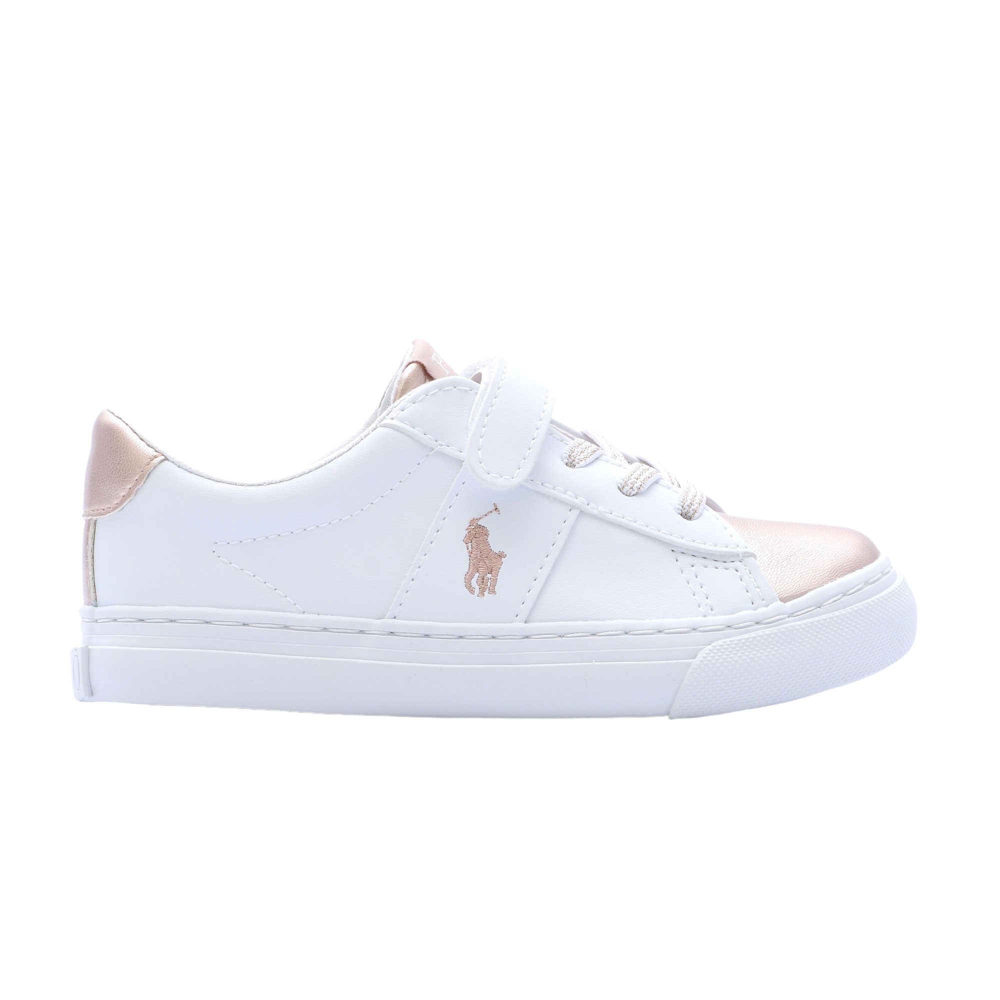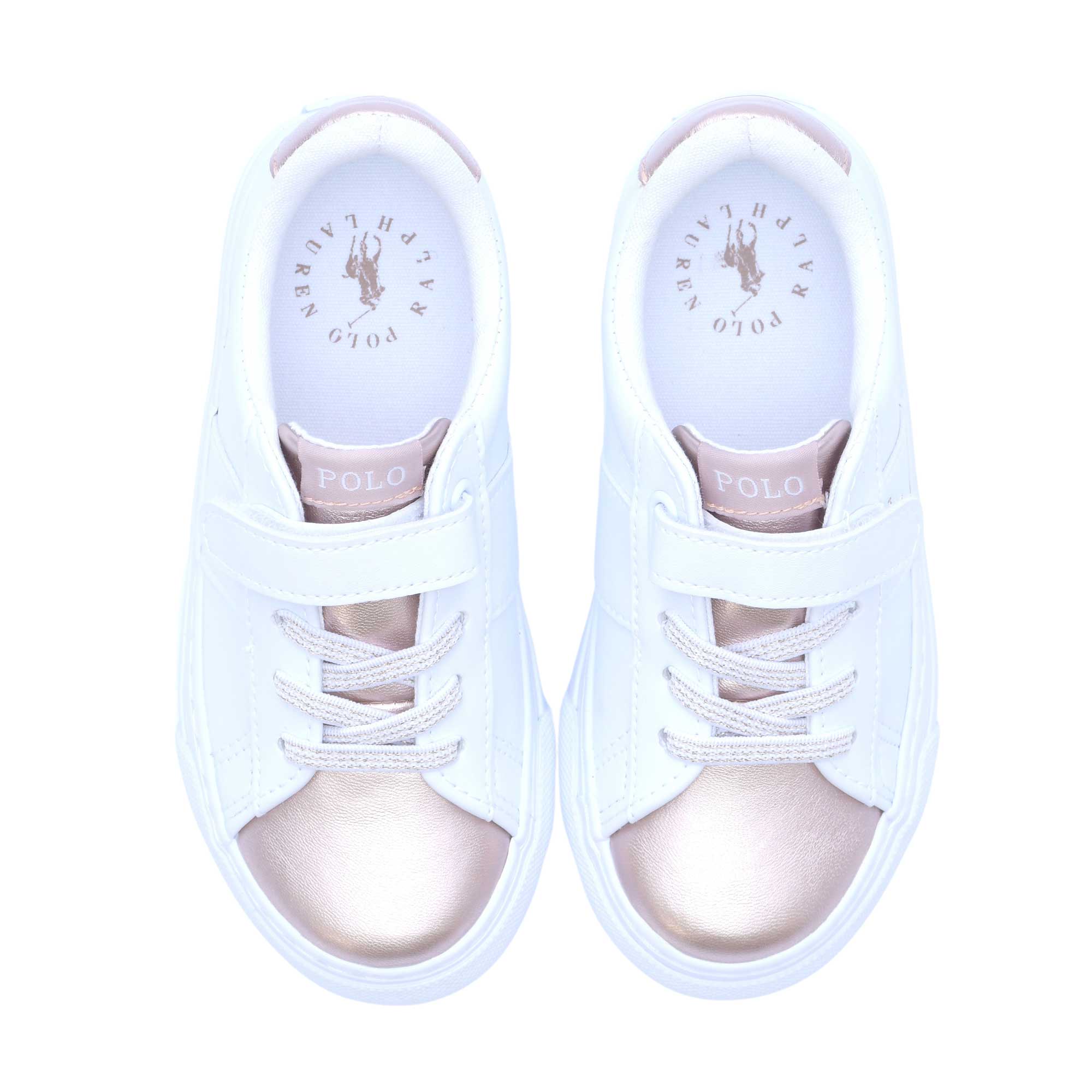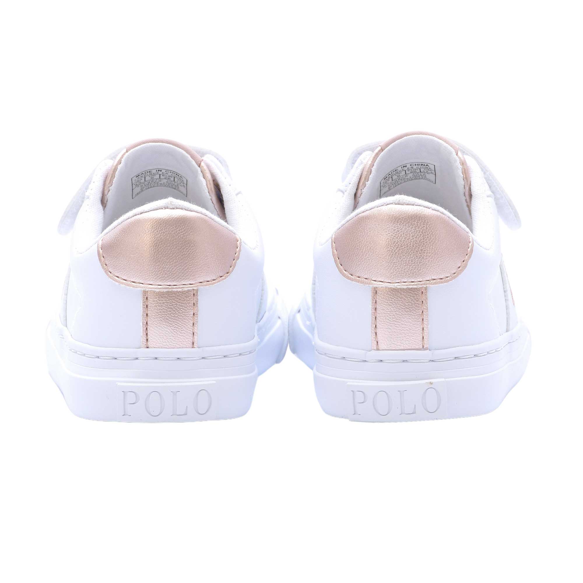 | Ralph Lauren's classic white logo Sneaker for girls. It's made of supple leather and has the brand's distinctive pony embroidered in rose gold on the side, as well as a logo patch on the tongue. It boasts a rose gold toe box and tongue, as well as an embossed logo on the rear. White insole and non-slip rubber outsole complete the look. It fastens with a velcro strap and gold thread lace and comes in a branded box. SPECIFICATIONS: