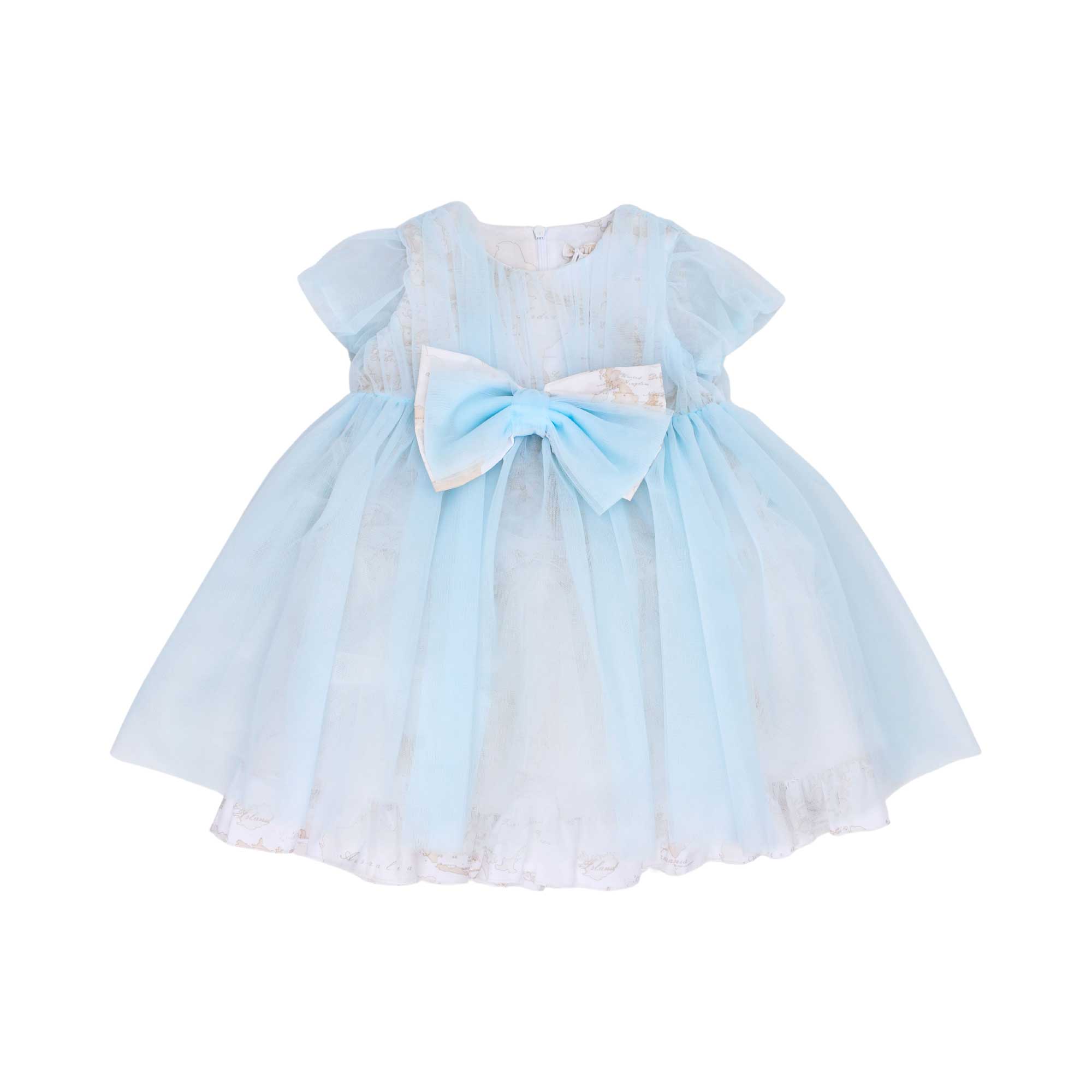 The Alviero Martini Kids Girl's Blue Geo Dress is a charming and stylish piece perfect for special occasions. Designed with short sleeves and a classic crew neck, the dress offers a comfortable yet elegant fit. The gathered waistline creates a flattering silhouette, complemented by a charming bow at the front that adds a touch of feminine detail. Crafted with layered tulle, the dress has a flared design that enhances its playful and graceful look. The interior is lined with the signature Geo Map print, subtly reflecting the brand’s travel-inspired aesthetic. A concealed zip fastening at the back ensures a smooth, polished appearance while making dressing effortless. This dress perfectly combines sophistication and fun, making it a delightful addition to any young girl’s wardrobe.
