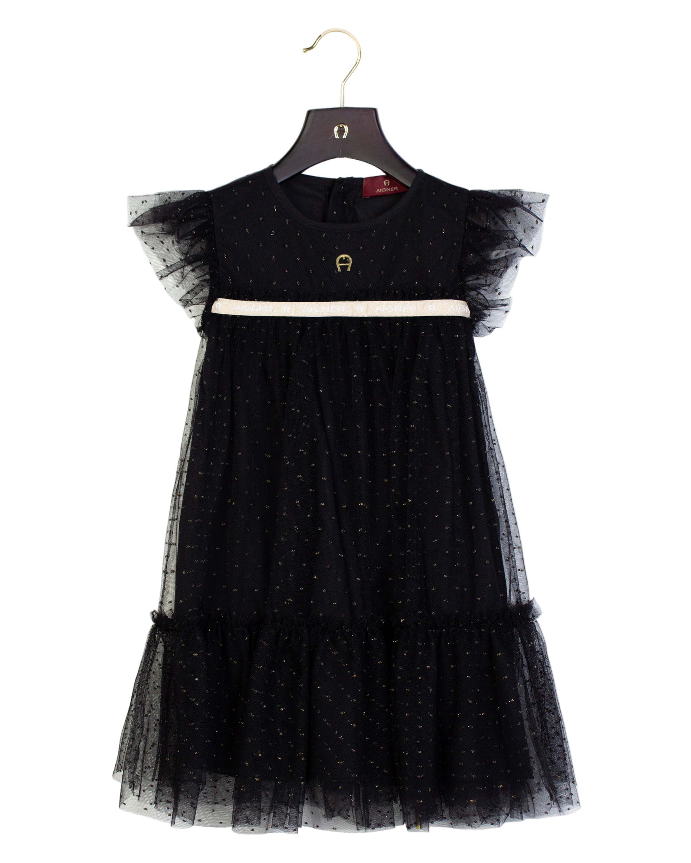 The Aigner Kids Girl's Pink Tulle Dress with Gold Polka Dots is a charming and elegant outfit, perfect for special occasions and celebrations. Crafted from soft, layered tulle, the dress features delightful gold polka dot accents throughout, adding a touch of sparkle and playfulness to its design. A distinctive AIGNER logo waistband adorned with metallic detailing gently cinches the waist, providing a signature look while enhancing the dress’s overall sophistication. The ruffled flutter sleeves offer an extra dash of elegance and whimsy, making the dress both fashionable and fun to wear. For added comfort, a lightweight inner lining ensures that your child feels cozy throughout the day. Designed with practicality in mind, the back button fastening allows for easy dressing and undressing, making this dress as functional as it is beautiful.