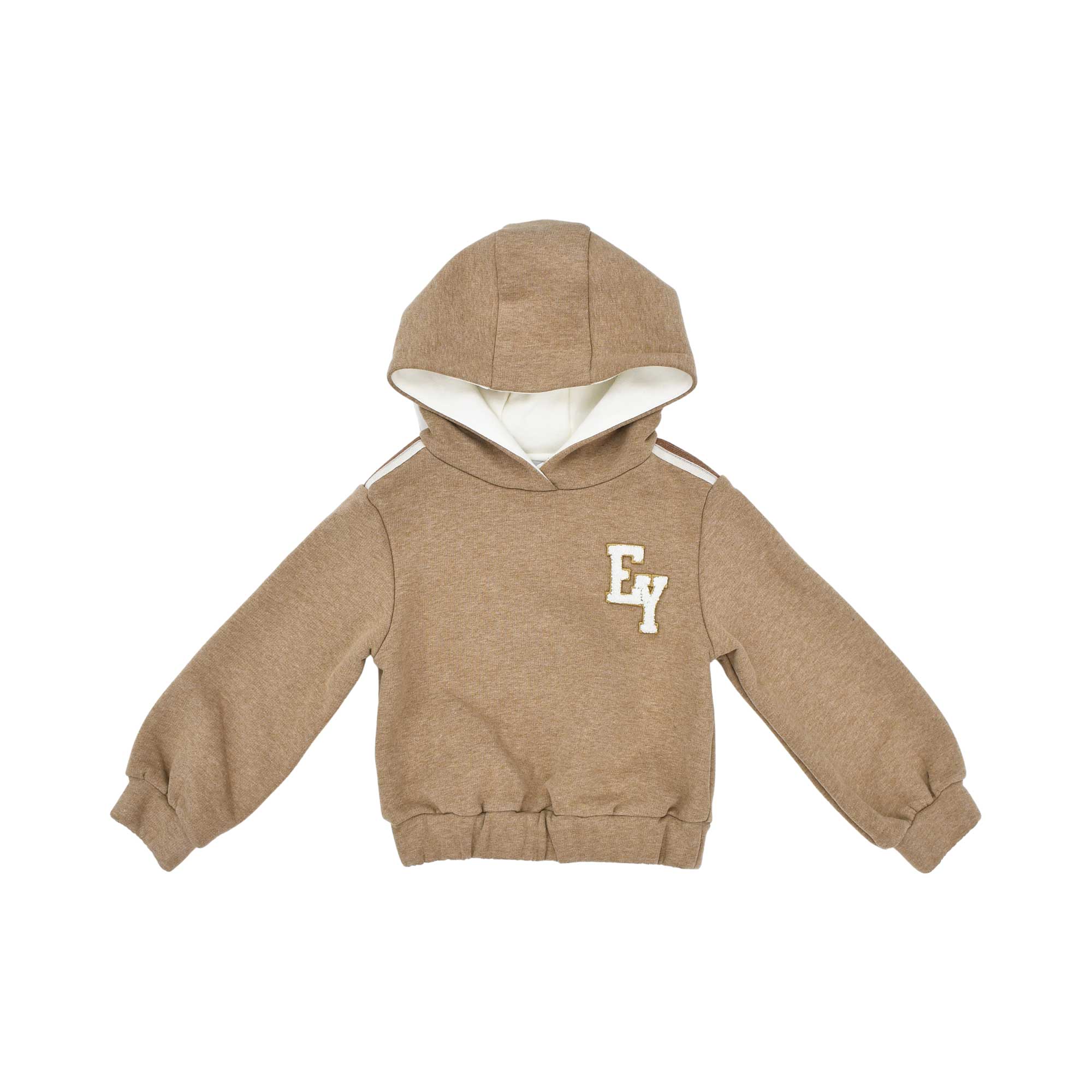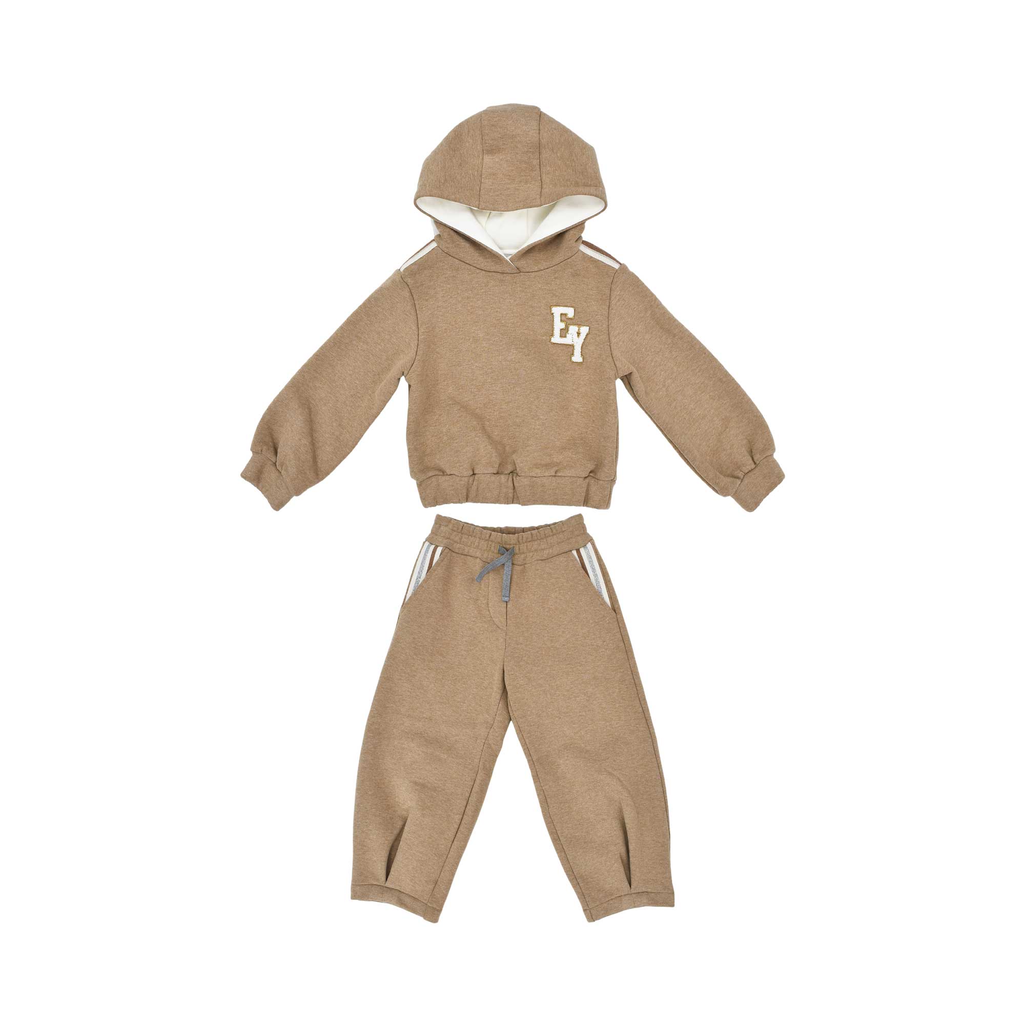 The Eleventy Kids Beige Jogging Suit brings effortless comfort and modern Italian flair to your child’s wardrobe. This cozy two-piece set includes a hooded sweatshirt with the signature “EY” logo patch, paired with matching jogger pants for a relaxed yet polished look.