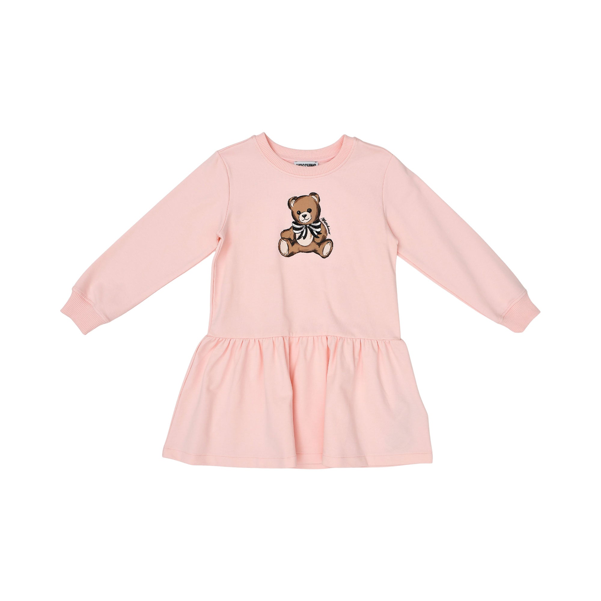 The Moschino Kids Girl's Pink Long Sleeve Dress is a delightful and stylish choice from the renowned luxury Italian designer, Moschino. Crafted from soft, comfortable cotton, this pretty pink dress is perfect for girls who love both comfort and fashion. The front of the dress showcases Moschino’s iconic teddy bear, brought to life with sparkling sequin embellishments and a bold logo print, adding a touch of playful glamour. Thoughtful details such as ribbed trims ensure a snug fit, while the flounce hemline gives the dress a fun, feminine flair. This dress embodies Moschino’s signature blend of quality, comfort, and standout design, making it an adorable wardrobe addition for any young fashionista.