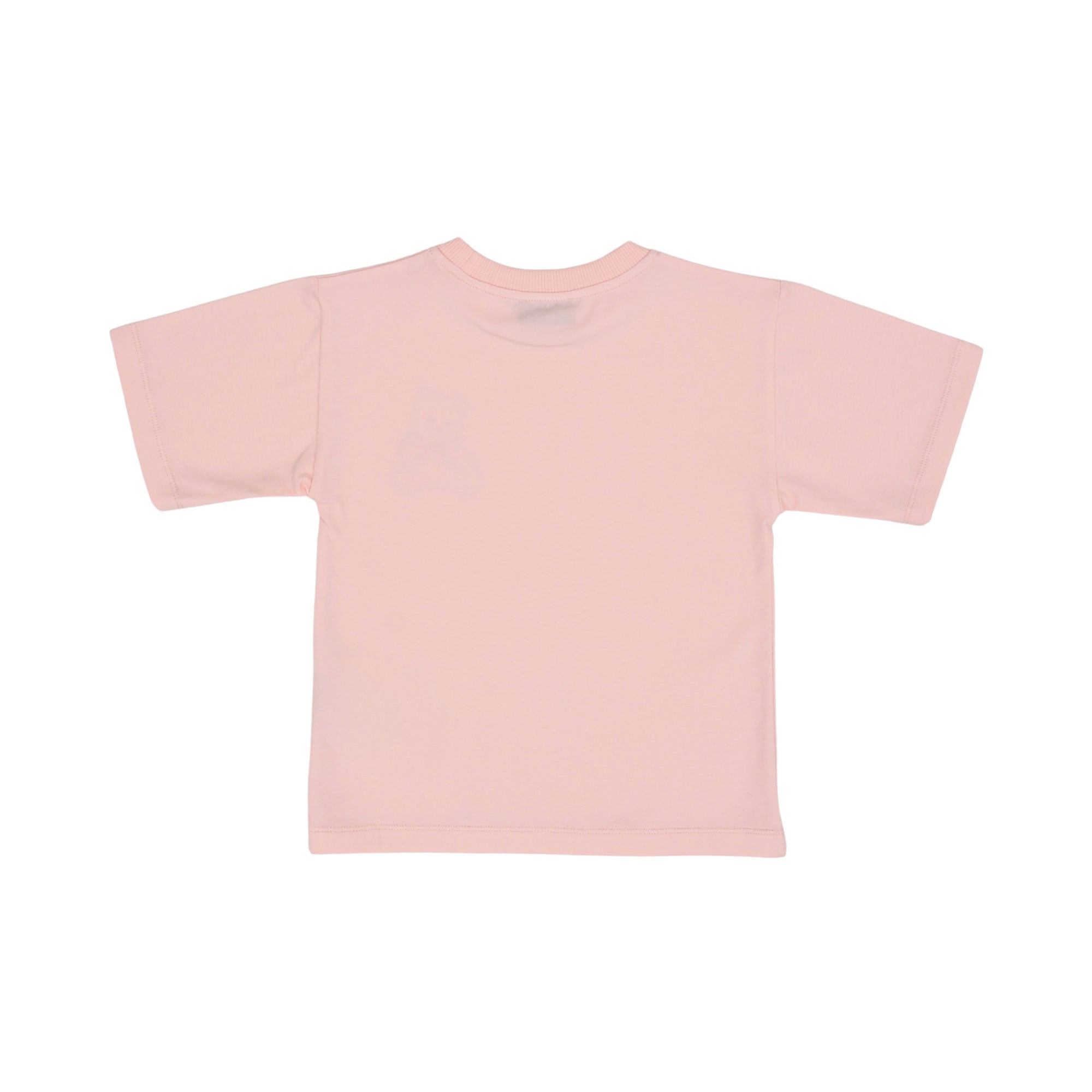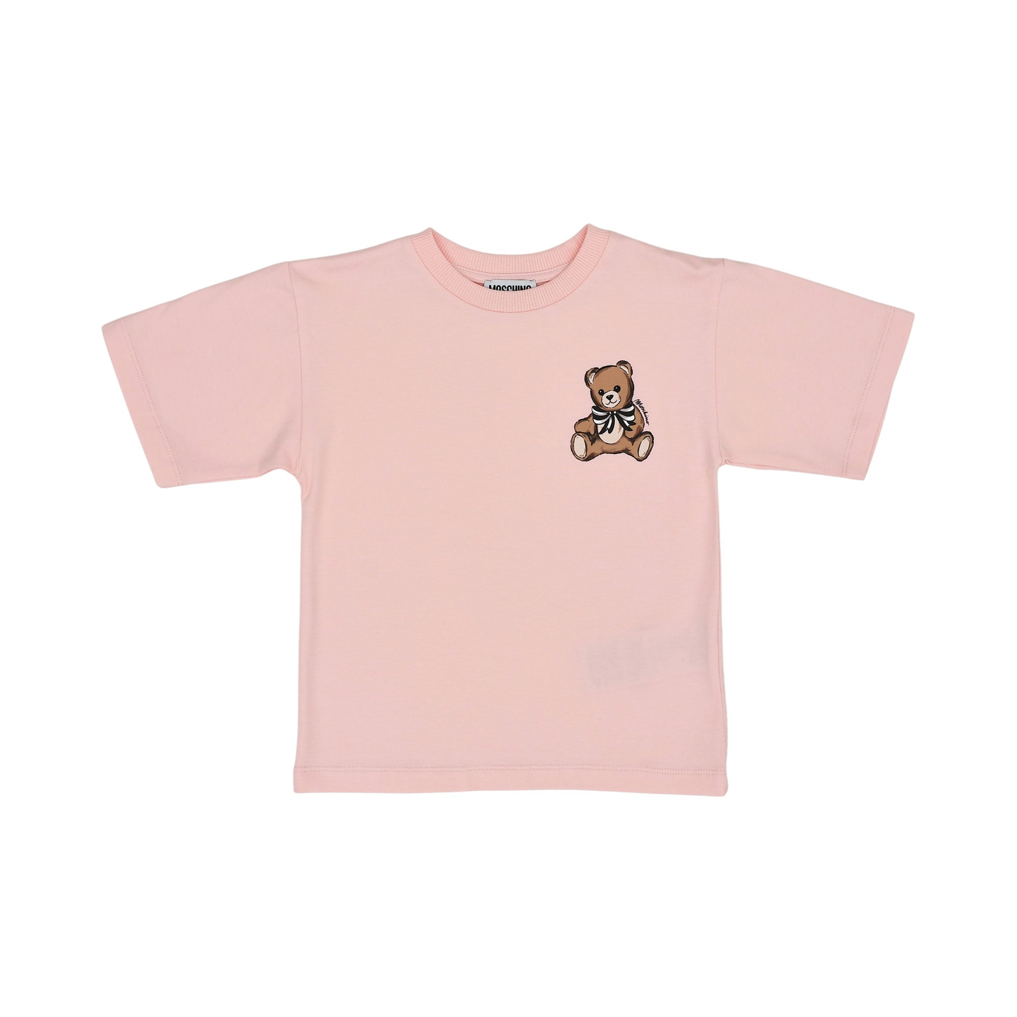 The Moschino Kids Girl's Pink T-Shirt is a charming and playful addition to any young fashionista's wardrobe. Crafted from soft, breathable cotton, this T-shirt ensures comfort for all-day wear. It features classic short sleeves and a crew neck for a timeless, easy-to-layer silhouette. The stand-out detail is the adorable teddy bear print at the front, a signature motif that adds a touch of whimsy and fun. Designed in a lovely pink hue, this T-shirt is finished with a straight hem, making it a versatile piece that pairs effortlessly with jeans, skirts, or shorts for a cute and stylish look.