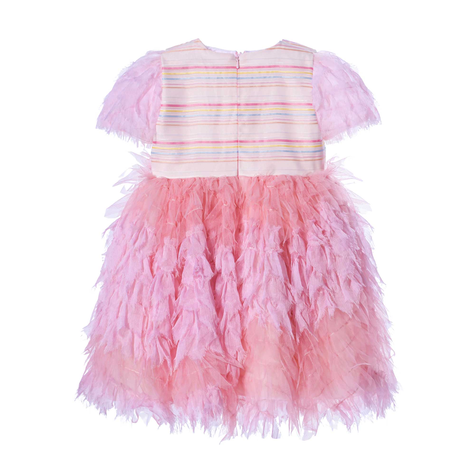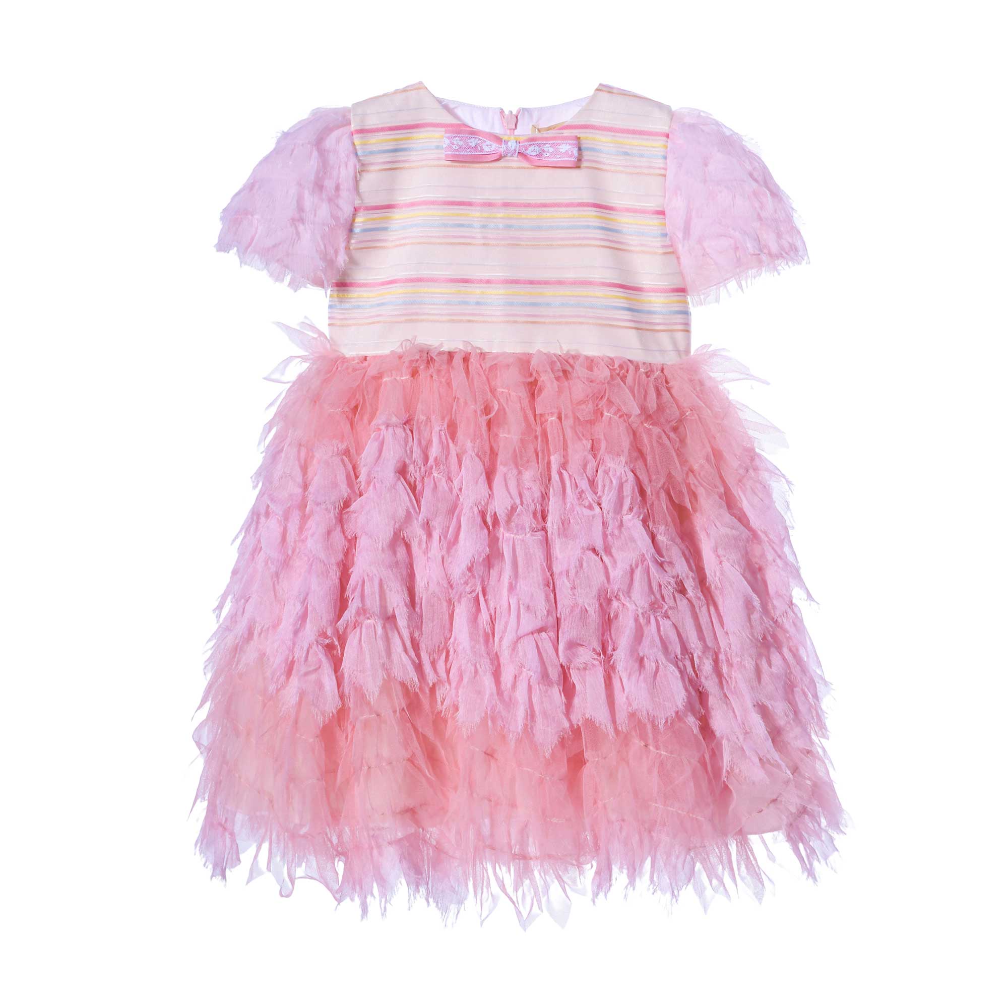 The Piccola Speranza Kids Girl's Pink Dress is a perfect addition to your little girl's wardrobe. The dress features a sumptuous layered handkerchief hemline and short sleeves with a round neck featuring a bow detail, back zip fastening and top with multicolor horizontal lines and a ruffle design on skirt and sleeves. The dress is crafted from the finest fabric and will be sure to make your little one stand out from the crowd. Perfect for special occasions, the dress is sure to be admired by all. With its beautiful design and eye-catching details, this dress will make a stunning statement wherever it is worn. SPECIFICATIONS: