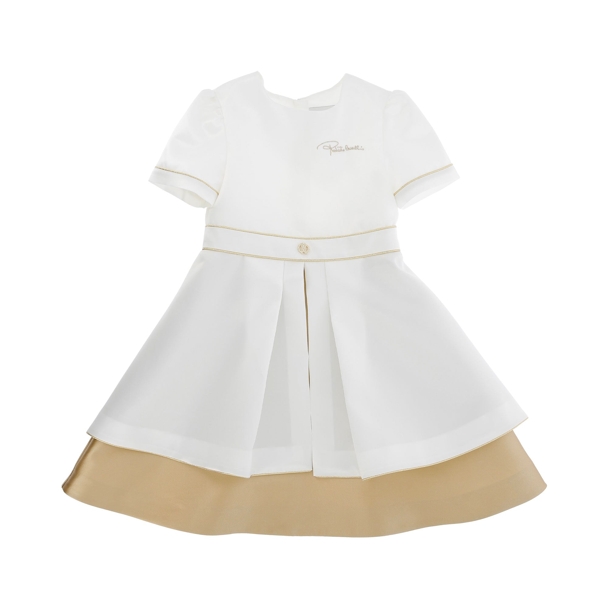 The Roberto Cavalli Kids Girl's White Dress is an elegant and stylish piece designed with both comfort and sophistication in mind. This short-sleeved dress features a classic crew neck and showcases the Roberto Cavalli signature embroidered on the chest, adding a recognizable touch of luxury. The waist is adorned with a metallic RC Monogram that enhances the refined look, complemented by delicate thin golden trims on the sleeves and waist for a subtle yet striking detail. The gold skirt is uniquely designed with an insert featuring a faux slit, detailed with front and back pleats that add movement and charm to the silhouette. Equipped with a zipper fastening at the back for easy wear, the dress is fully lined to ensure comfort and quality, making it an excellent choice for special occasions.