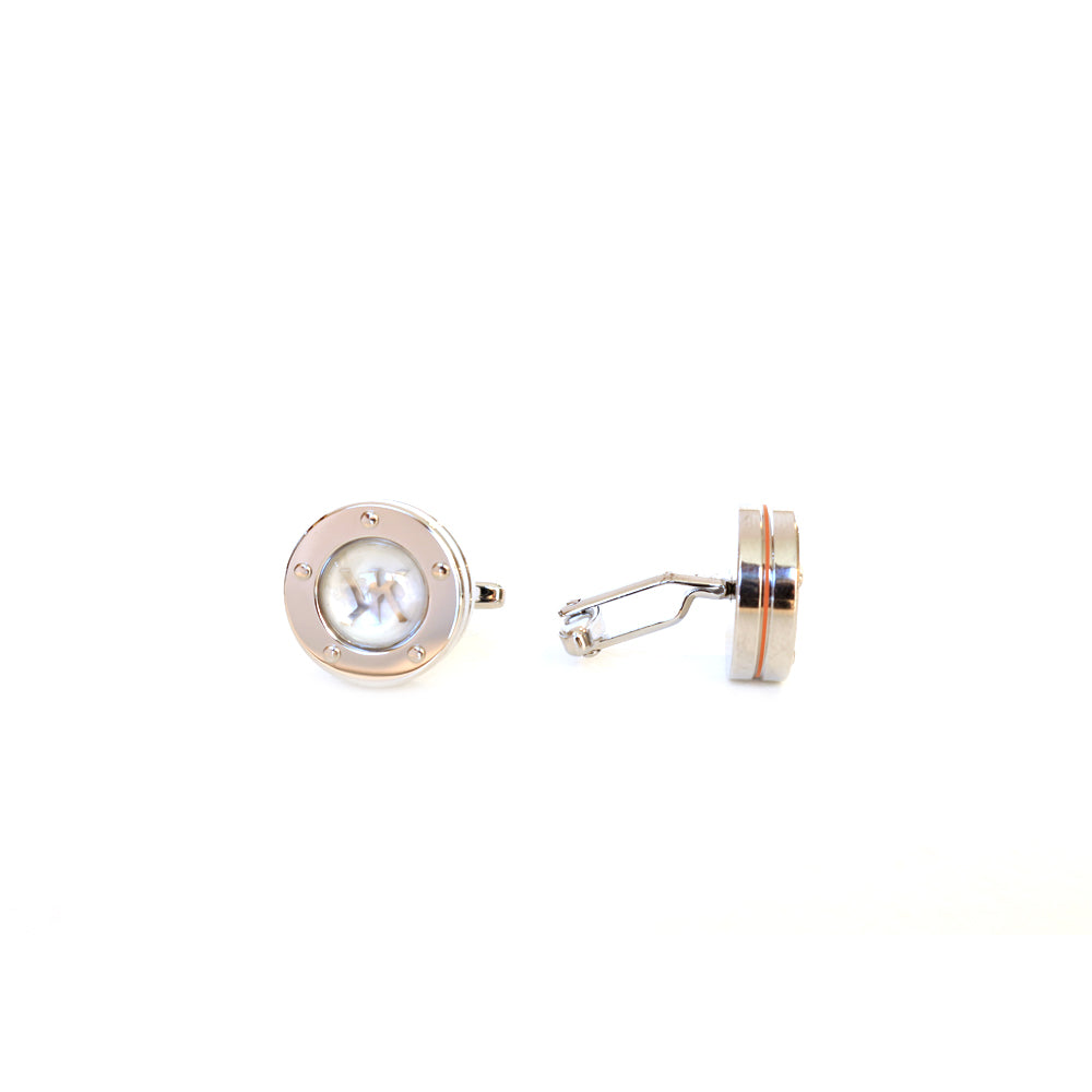 Korloff Cufflink Full Stainless Steel with Glass Crystal on Top and White Mother of Pearl / Steel Brand Logo & Orange Lining Design on the Side is a sophisticated and stylish accessory for the modern man. This cufflink features a full stainless steel construction, making it durable and long-lasting. The top of the cufflink is adorned with a sparkling glass crystal, adding a touch of elegance and luxury. The white mother of pearl detail on the steel brand logo gives the cufflink a unique and eye-catching design. It adds a subtle pop of color and texture to the overall look. The orange lining on the side adds a bold and contemporary touch to the cufflink, making it stand out from traditional designs. This cufflink is not only a fashion accessory but also a statement piece that reflects the wearer's confidence and style. It is suitable for any special occasion, from formal events to everyday wear. The Korloff Cufflink Full Stainless Steel with Glass Crystal on Top and White Mother of Pearl / Steel Brand Logo & Orange Lining Design on the Side is a must-have for any fashion-forward man.