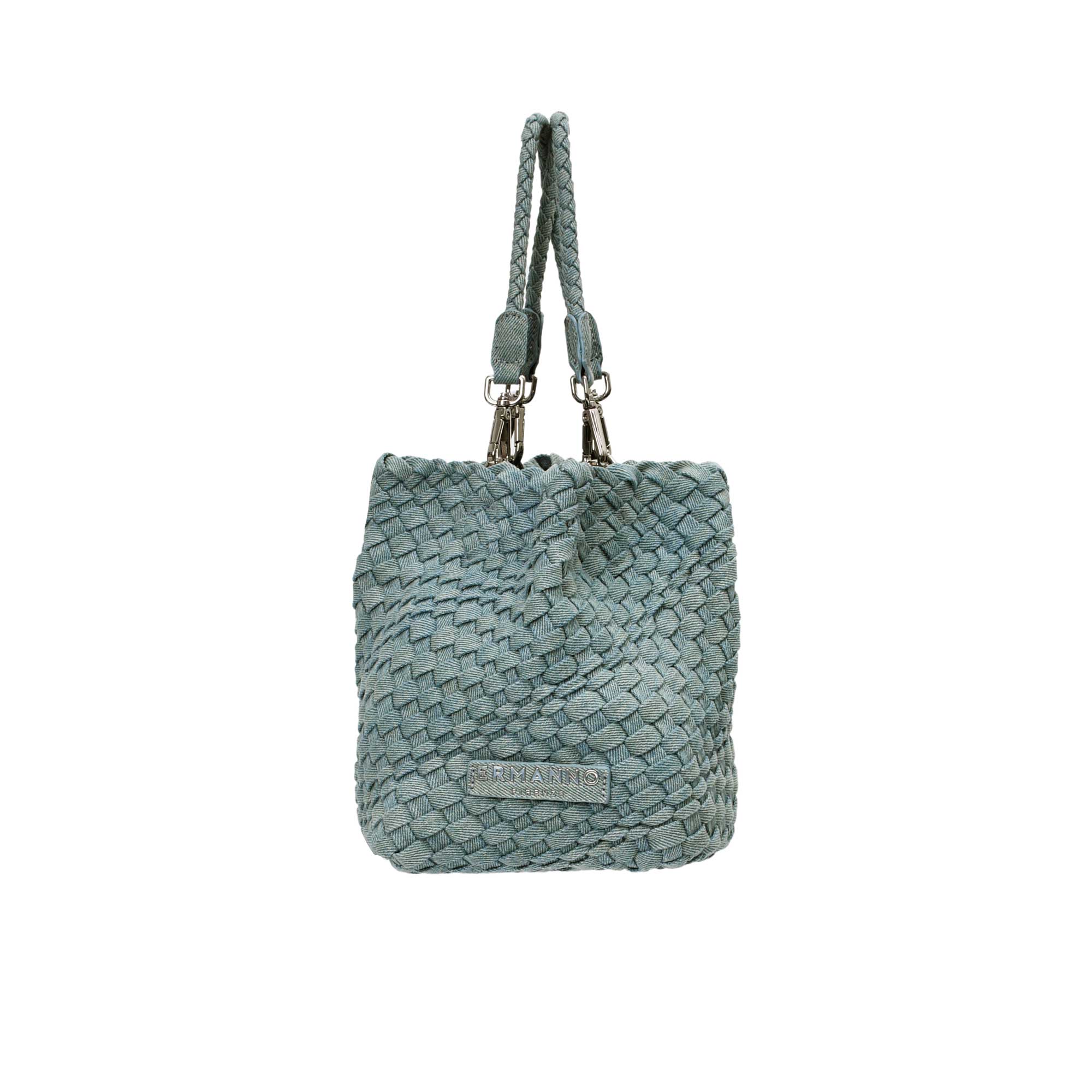 The Ermanno Firenze Women's Medium Denim Blue Tote Bag is a chic and contemporary accessory perfect for adding a touch of casual elegance to any ensemble. Crafted from durable denim fabric, the bag features distinctive woven crossed stripes that add texture and visual interest to its classic silhouette. It is designed with detachable handles and chains, allowing for versatile carrying options that can easily transition from day to evening wear. The tote is secured with a convenient magnetic closure, ensuring both ease of access and safety for your belongings. Completing the look is a matching denim logo monogram, subtly incorporated to reflect the brand’s identity while maintaining a cohesive and stylish appearance. This tote bag effortlessly combines practicality with a trendy, laid-back vibe.