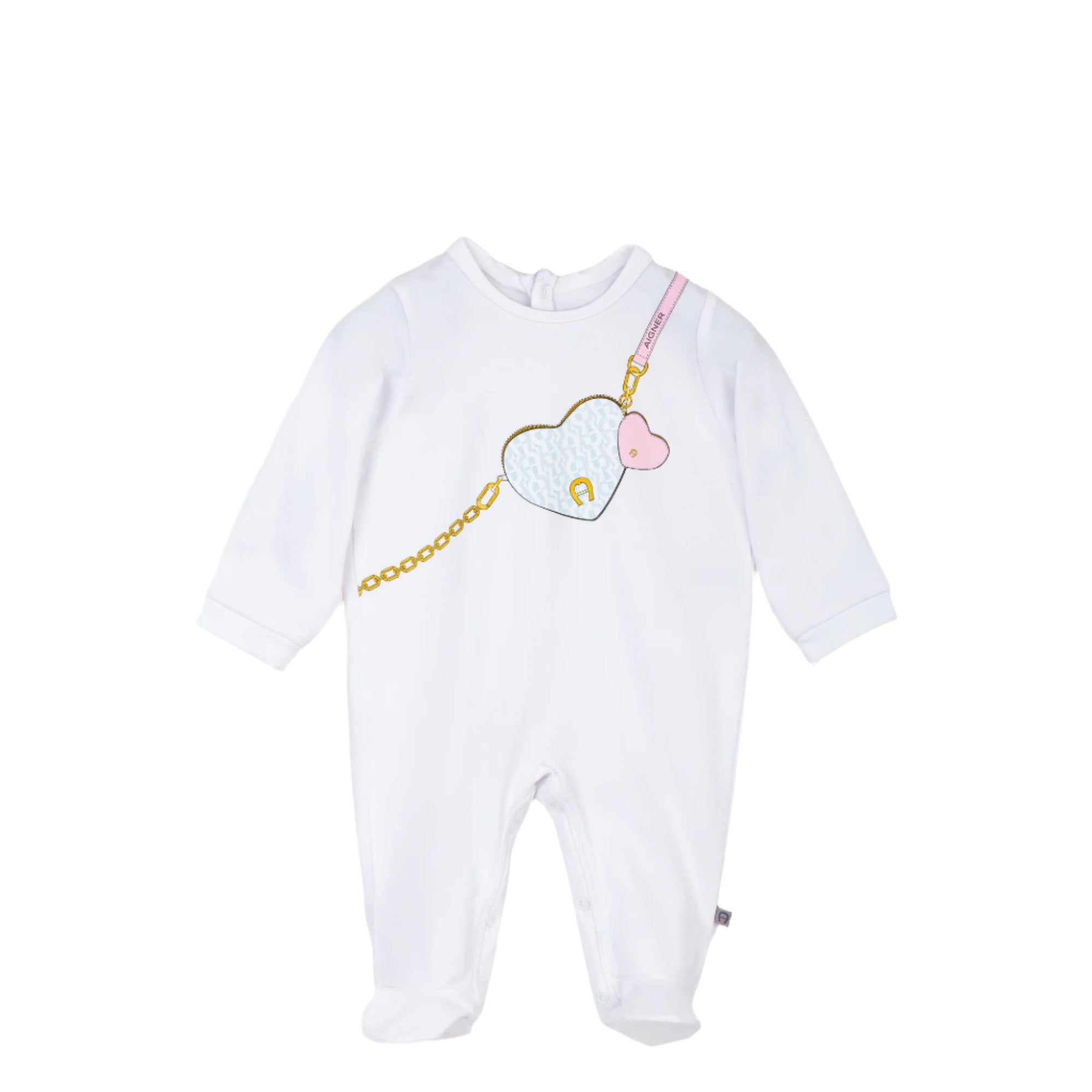 The Aigner Kids New Born Girl's Sleepsuit is a charming and cozy outfit for your little one. Made of soft and breathable cotton jersey, it is perfect for keeping your baby comfortable throughout the day and during bedtime. The suit also features a crossbody heart bag print, adding a cute and stylish touch to the design. It comes with foot covers to keep your baby's tiny feet warm and snug. The back and between the legs have snap button fastenings for easy dressing and diaper changes. This sleep suit is not only practical and comfortable but also adorable, making it a must-have for new parents.