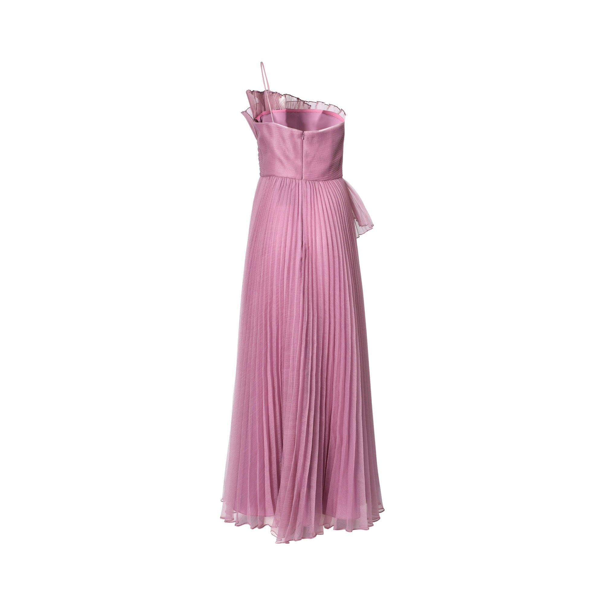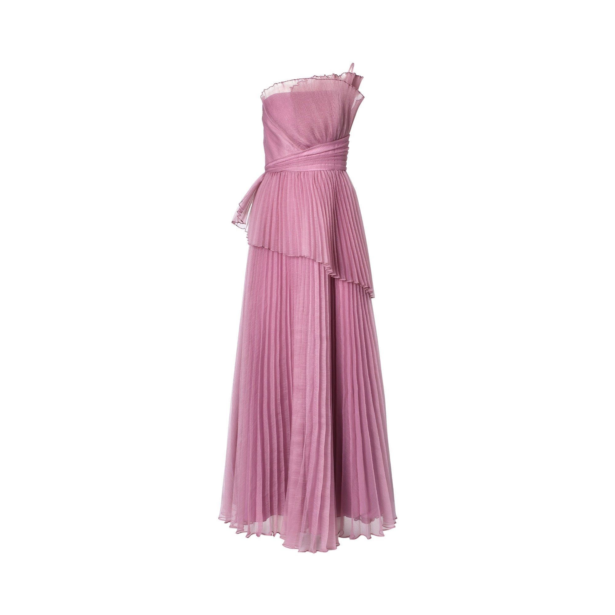 • Features a floor-length, pleated A-line silhouette that flows gracefully.