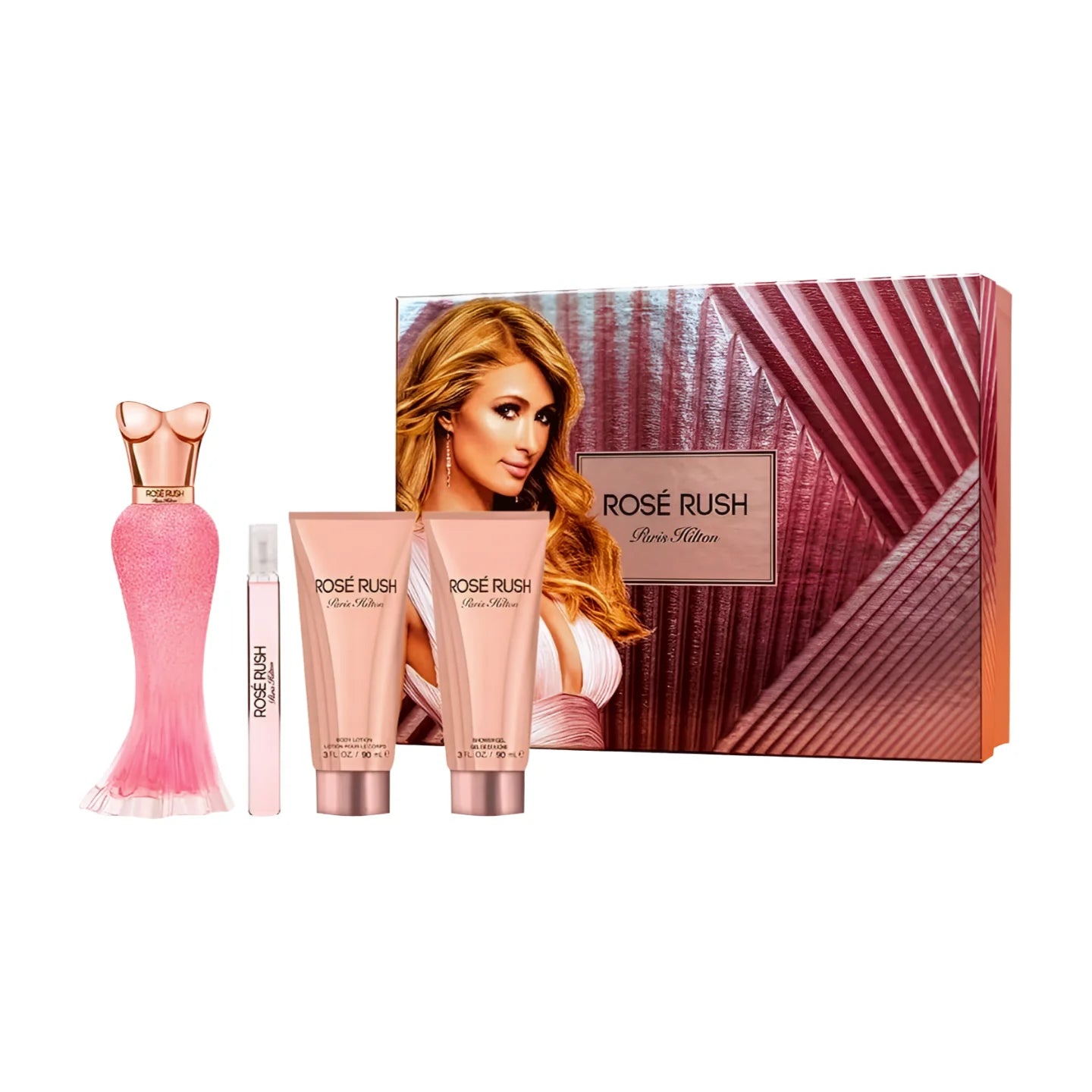Paris Hilton Rose Rush Eau de Parfum for Women flirts your way through your day with the scent of a playful woman. This fun-loving scent works well all day and late into the night. A floral, rose, and fruity fragrance with moderate sillage, get the party started by adorning your outfits with this playful scent. Give yourself a boost with a spritz of this long-lasting scent that captivates with stunning summery appeal. Luscious top notes feature orange blossom, rose petals, and lychee. Middle notes include juicy papaya, rose of May, and peony. Delicious base notes that finish the scent are white musk, amber, and cedar. Comes in a 100ml + 10ml + 90ml BL + 90ml SG mini set.