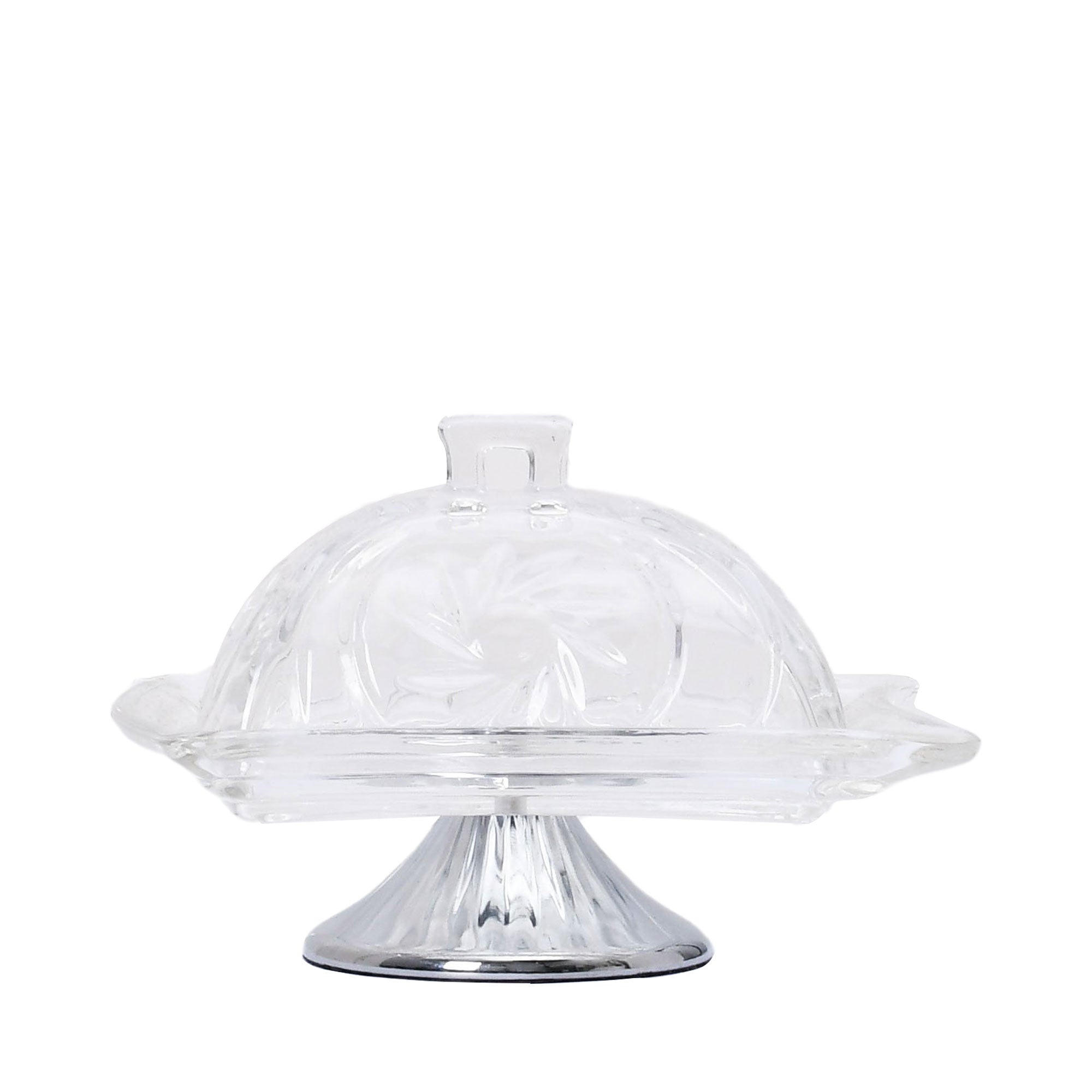 The Ele 4PM Glass Serving Dessert Stand is a refined and elegant addition to any table setting. It features a clear, fluted glass base that rests gracefully on a sleek silver-toned pedestal, lending the piece a classic and sophisticated appearance. The dome-shaped lid is adorned with an intricate starburst-like pattern, adding delicate visual interest, and is topped with a convenient handle for easy lifting and access. Perfectly suited for serving butter, cheese, or small desserts, this exquisite stand combines functionality with timeless style, enhancing the presentation of your culinary offerings with effortless charm.