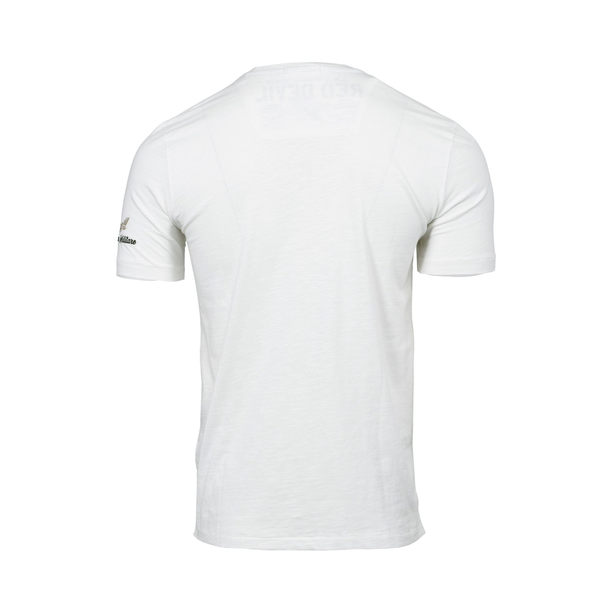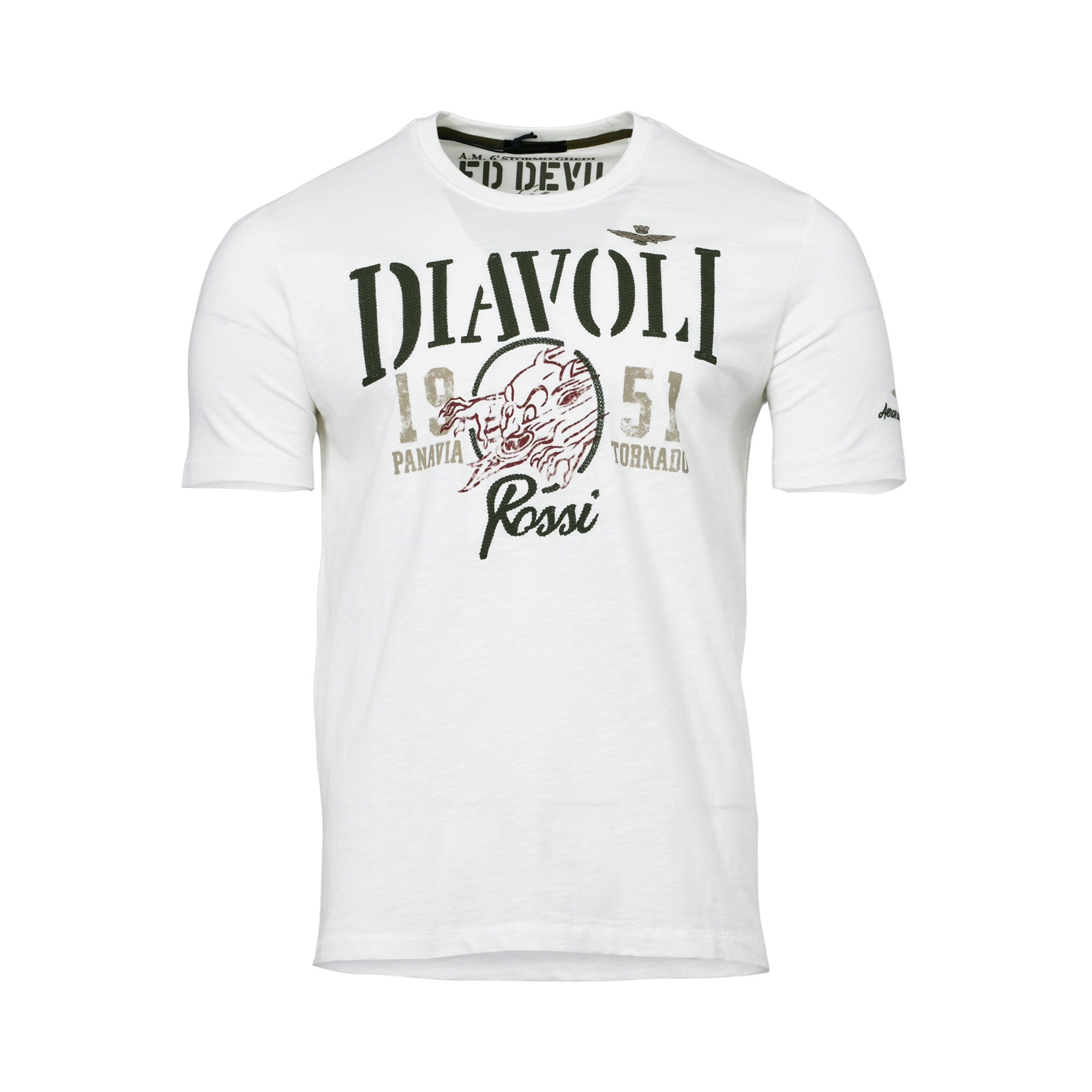 The Aeronautica Militare Men's White T-shirt seamlessly blends classic style with distinctive military-inspired details. Crafted with a straight cut, this T-shirt ensures a comfortable and flattering fit, while its round neck design lends a timeless and versatile appeal. The front is adorned with elaborate embroidery, featuring the brand's main logo alongside the bold "Diavoli Rossi" emblem, a nod to the renowned "Red Devils" squadron. Adding a unique touch, the sleeve showcases "Aeronautica Militare" lettering paired with an image of the iconic Panavia Tornado aircraft, celebrating the brand’s strong aviation heritage. Perfect for everyday wear, this T-shirt effortlessly combines style, comfort, and a sense of history.
