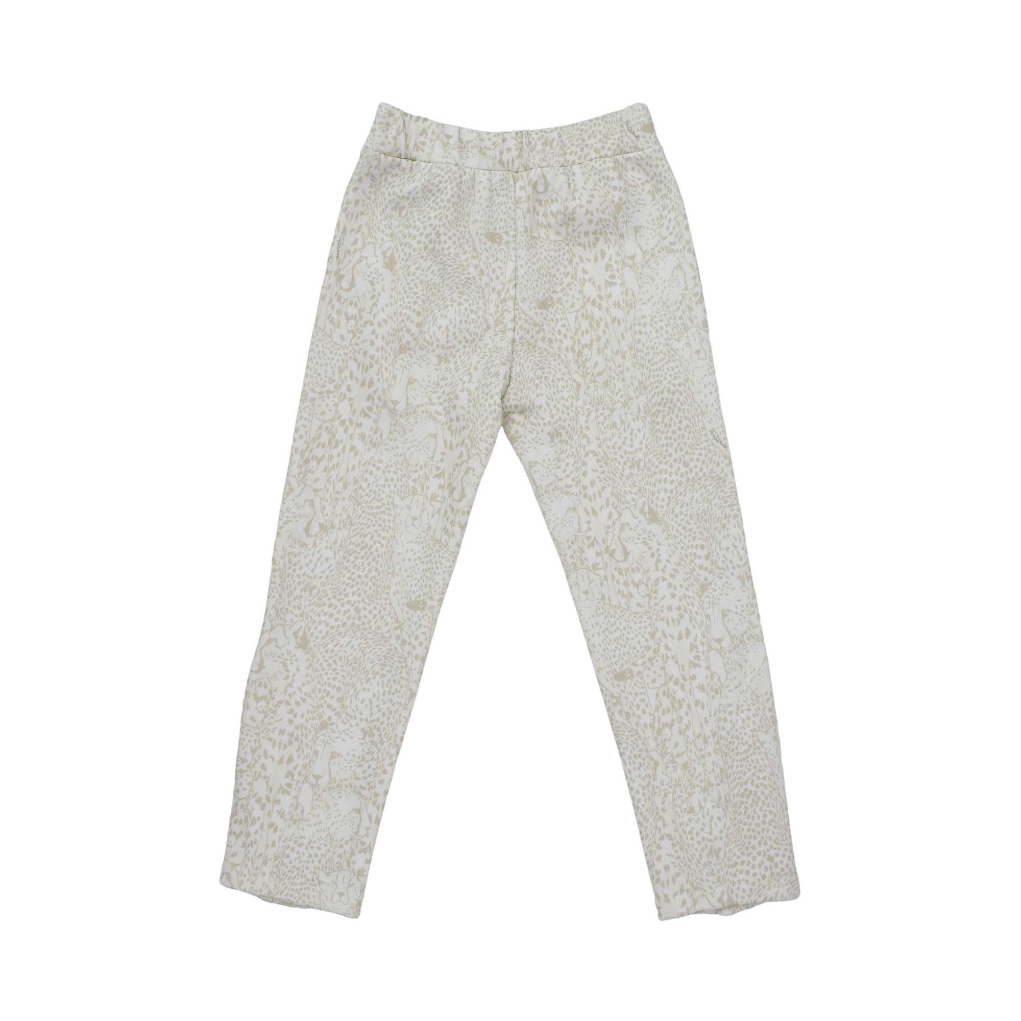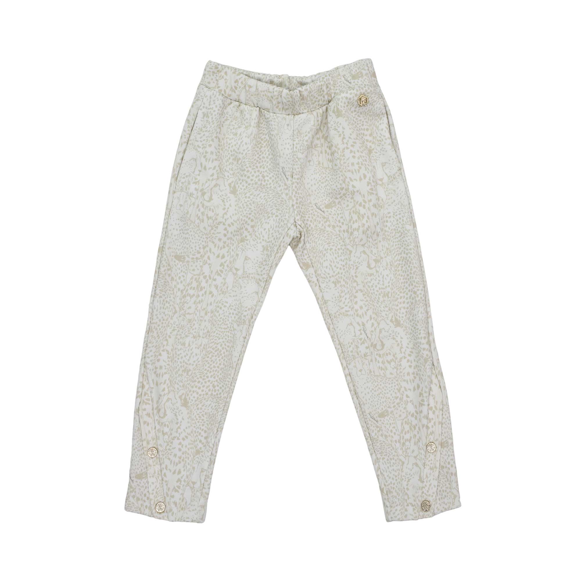 The Roberto Cavalli Kids Boy's Ivory and White Set, featuring a stylish T-shirt and leggings, masterfully combines comfort with signature designer flair. The T-shirt, crafted from pure cotton, offers a soft touch and features a classic crew neck and short sleeves for easy, everyday wear. Its standout detail is the embroidered Roberto Cavalli logo at the chest, complemented by a straight hem that ensures a relaxed fit. Paired with this is a striking pair of pure cotton sport leggings adorned with an all-over cheetah print, adding a playful yet fashionable edge to the ensemble. The leggings are further embellished with a golden metallic RC monogram on the front, elevating the set with a touch of luxury. Designed for both style and ease, the straight-leg silhouette is finished with elegant golden buttons at the hem, making this set an eye-catching choice for young trendsetters.