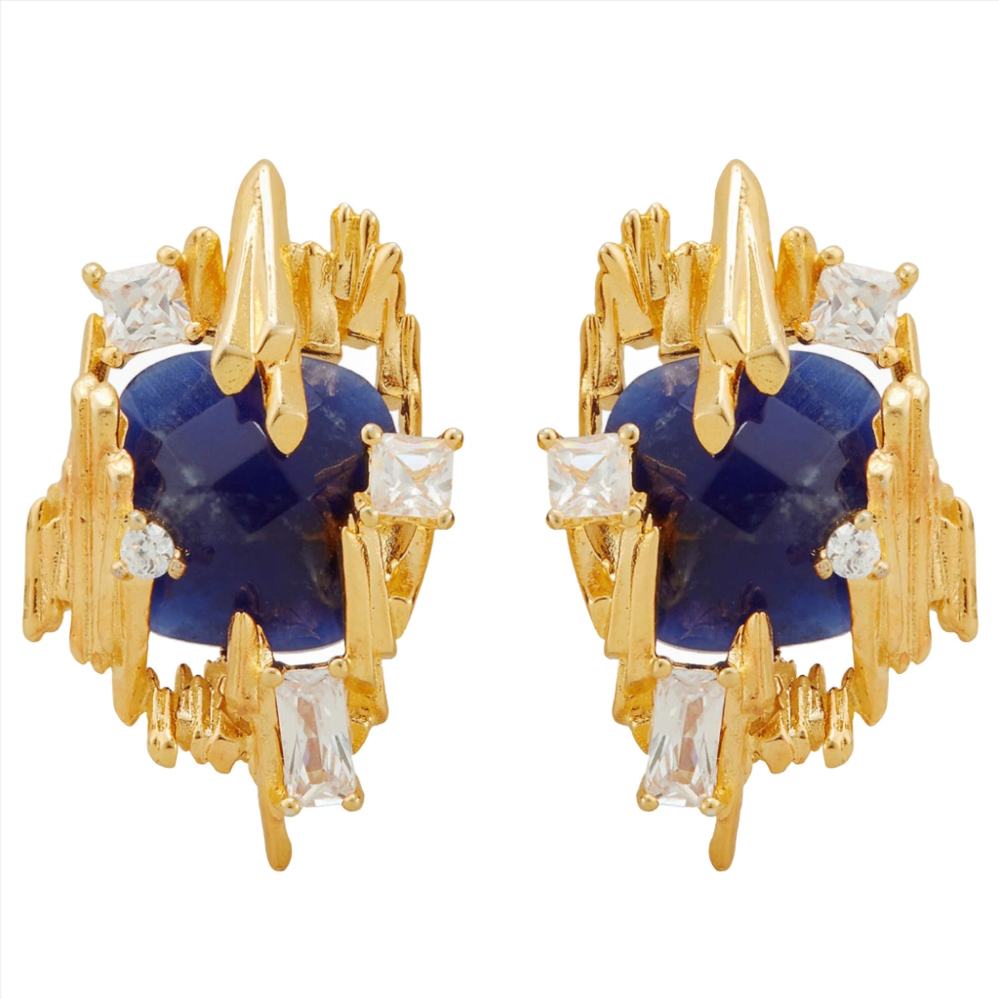 | This pair of clip-on earrings with steep lines, like a sea-eroded rock, reveals a fine stone of deep blue called sodalite. This refined jewel, studded with cubic zirconia, transports you to the heart of the Mediterranean waters of Sicily and makes your outfits shine. It is made of gilded brass, sodalite stone, and cubic zirconia. DIMENSIONS :