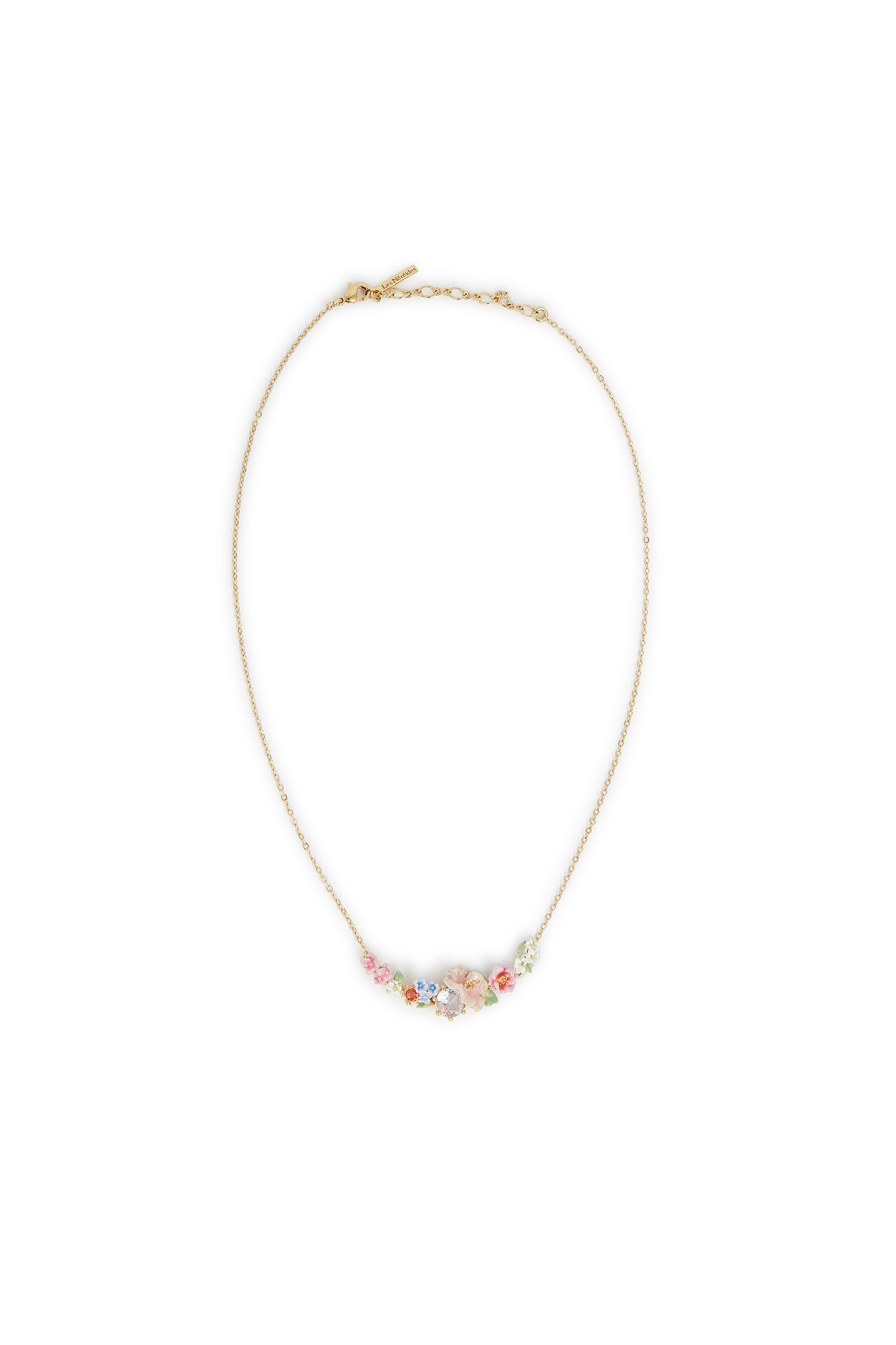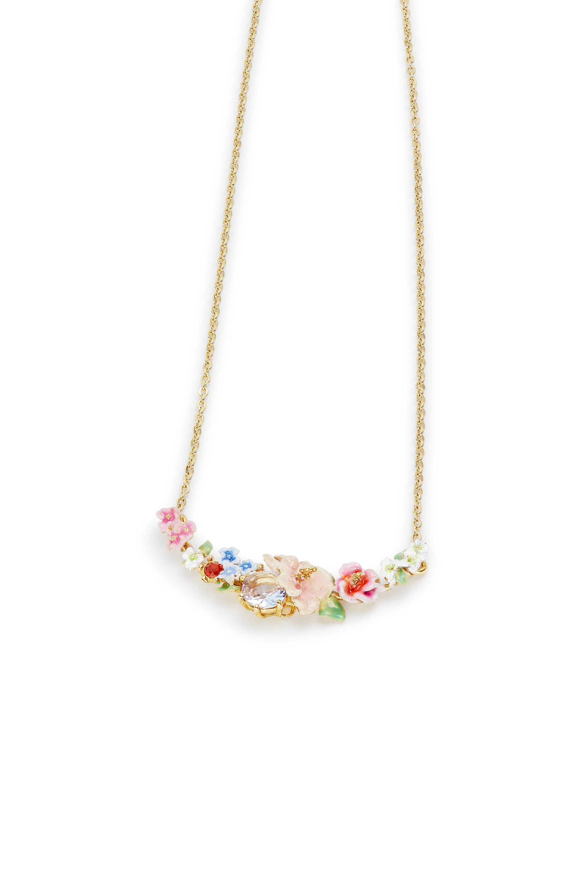 The Les Nereides Flower Bouquet and Round Stone Statement Necklace is a captivating piece that beautifully blends artistry and symbolism. This statement necklace features hand-enamelled flowers, including hollyhocks and hydrangeas, in delicate hues of blue, pink, and white, evoking the charm of a summer garden in full bloom. At its center lies an emerald-cut white faceted glass stone paired with a striking red faceted crystal, adding depth and brilliance to the design. Part of the Hortense's Garden collection, the necklace celebrates the beauty and resilience of hydrangeas, whose various shades of pink symbolize a beating heart and budding love. This floral bouquet embodies a timeless elegance, representing a flower that retains its splendor even without water, making the necklace a poetic tribute to enduring beauty and affection.