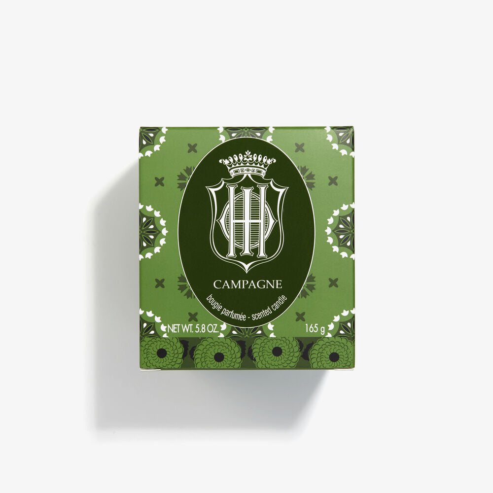 The campaign comes home… Inspired by Eau de Campagne, the Campagne scented candle is housed in an elegant forest-green glass holder and reveals a concentrated essence of nature with a chic and bold trail.