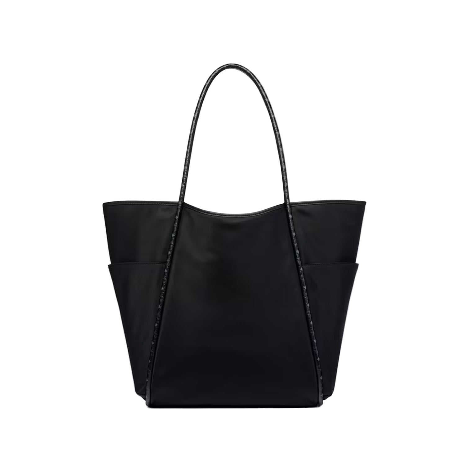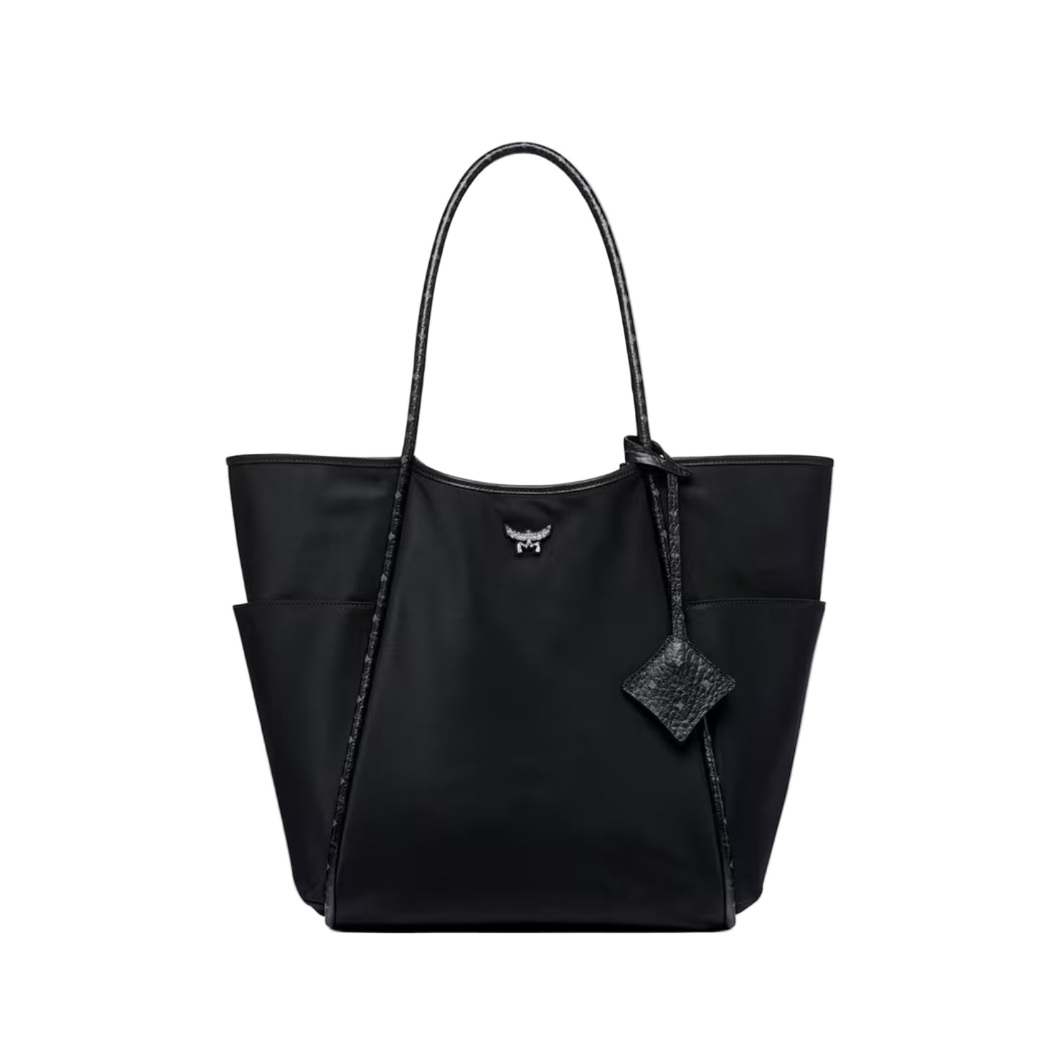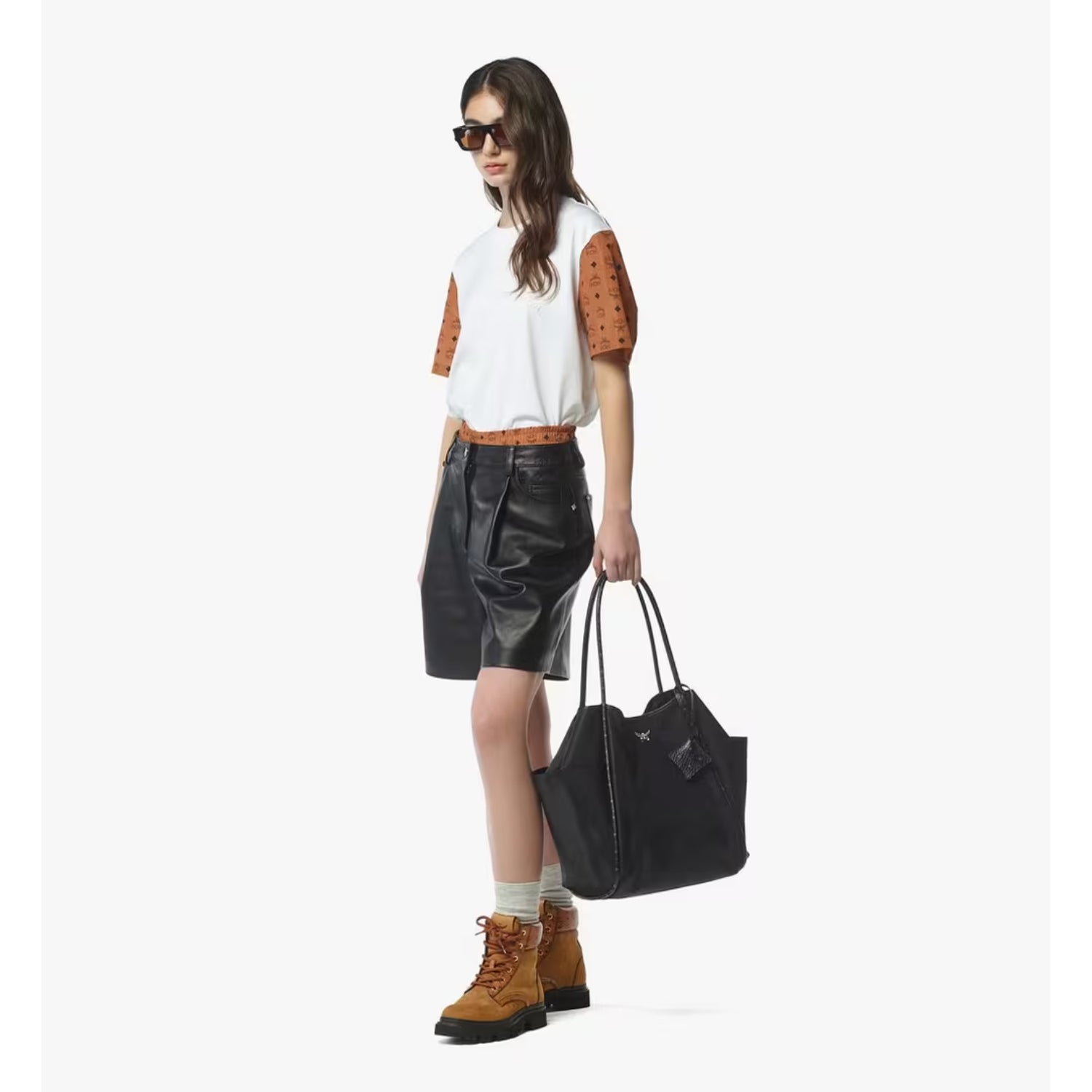 The MCM Women's Aren Shopper in ECONYL and Leather exemplifies a fusion of sustainable innovation and timeless luxury. Crafted in sleek black ECONYL® recycled nylon—sourced from repurposed fishing nets—the bag highlights MCM's commitment to fostering a more sustainable, waste-free future. This avant-garde shopper is elegantly accentuated by Visetos monogram-printed leather handles and a distinctive Bavarian diamond-inspired leather charm, adding signature touches of sophistication and heritage. Practicality is seamlessly woven into the design, with exterior pockets granting quick access to daily essentials, and an inner metal hook clasp allowing the spacious interior to be cinched at the sides for versatile styling and function. Altogether, the Aren Shopper beautifully balances modern eco-consciousness with iconic elements and superb usability.