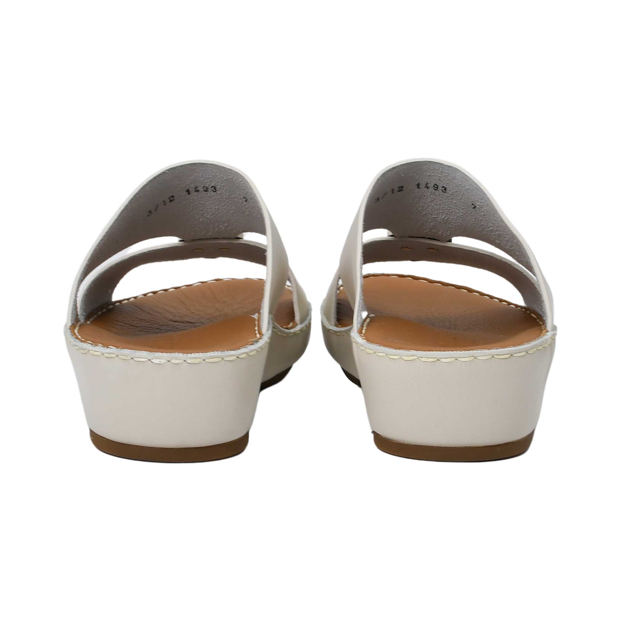 Sole: Features a supportive low wedge or platform sole in a contrasting neutral color (tan/brown), finished with visible stitching around the edge.