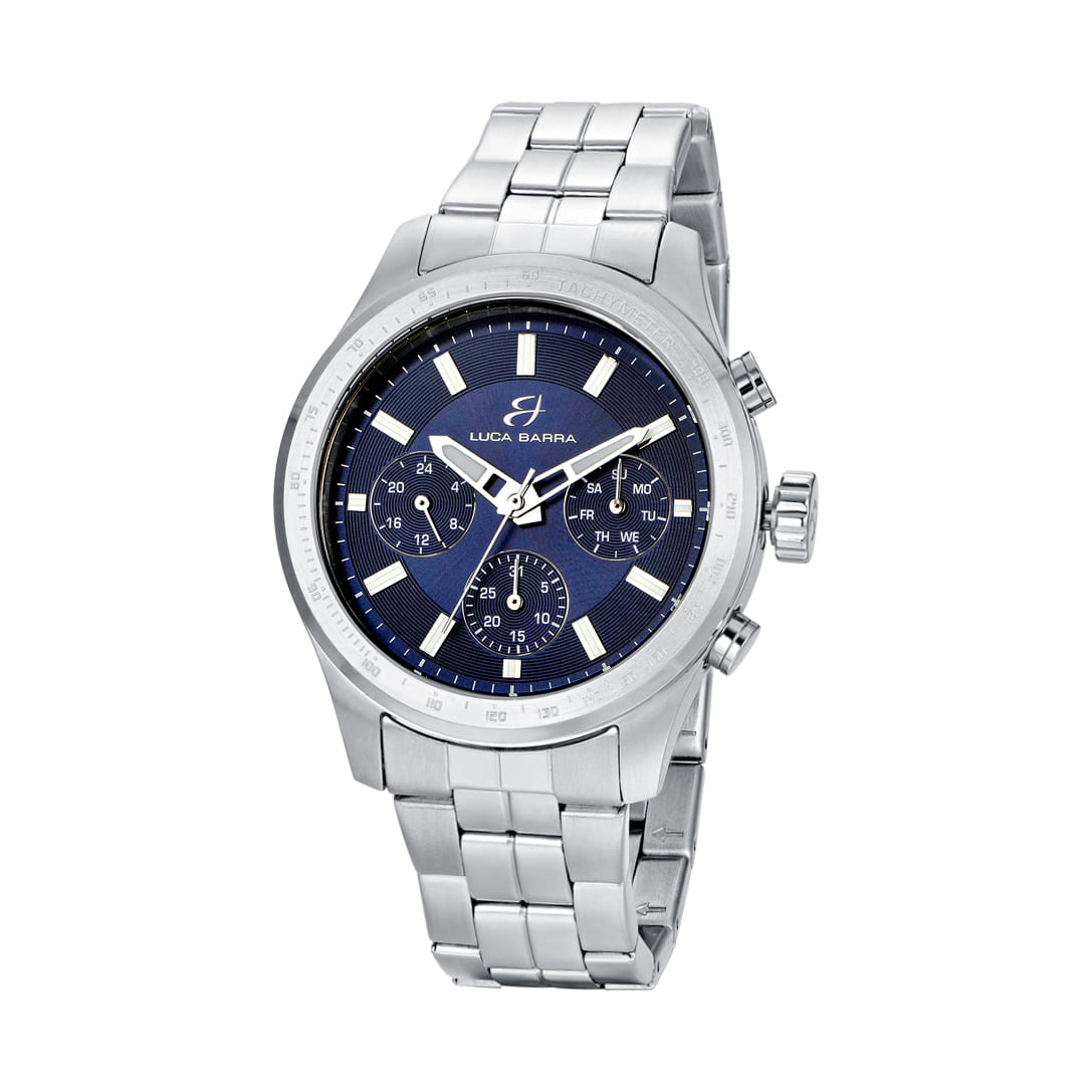 The Luca Barra Gents Steel Watch is a sophisticated timepiece designed for the modern man, featuring a striking blue dial complemented by a sleek silver bezel and matching silver details. With a case diameter of 41 mm, it offers a balanced and bold presence on the wrist, suitable for both casual and formal occasions. The watch is equipped with a multifunction movement, providing added functionality beyond just timekeeping. Additionally, it boasts a water resistance rating of 5 ATM, making it durable enough to withstand splashes and brief immersion in water, but not suitable for swimming or diving. This watch combines elegant aesthetics with practical features, making it a versatile accessory for everyday wear.