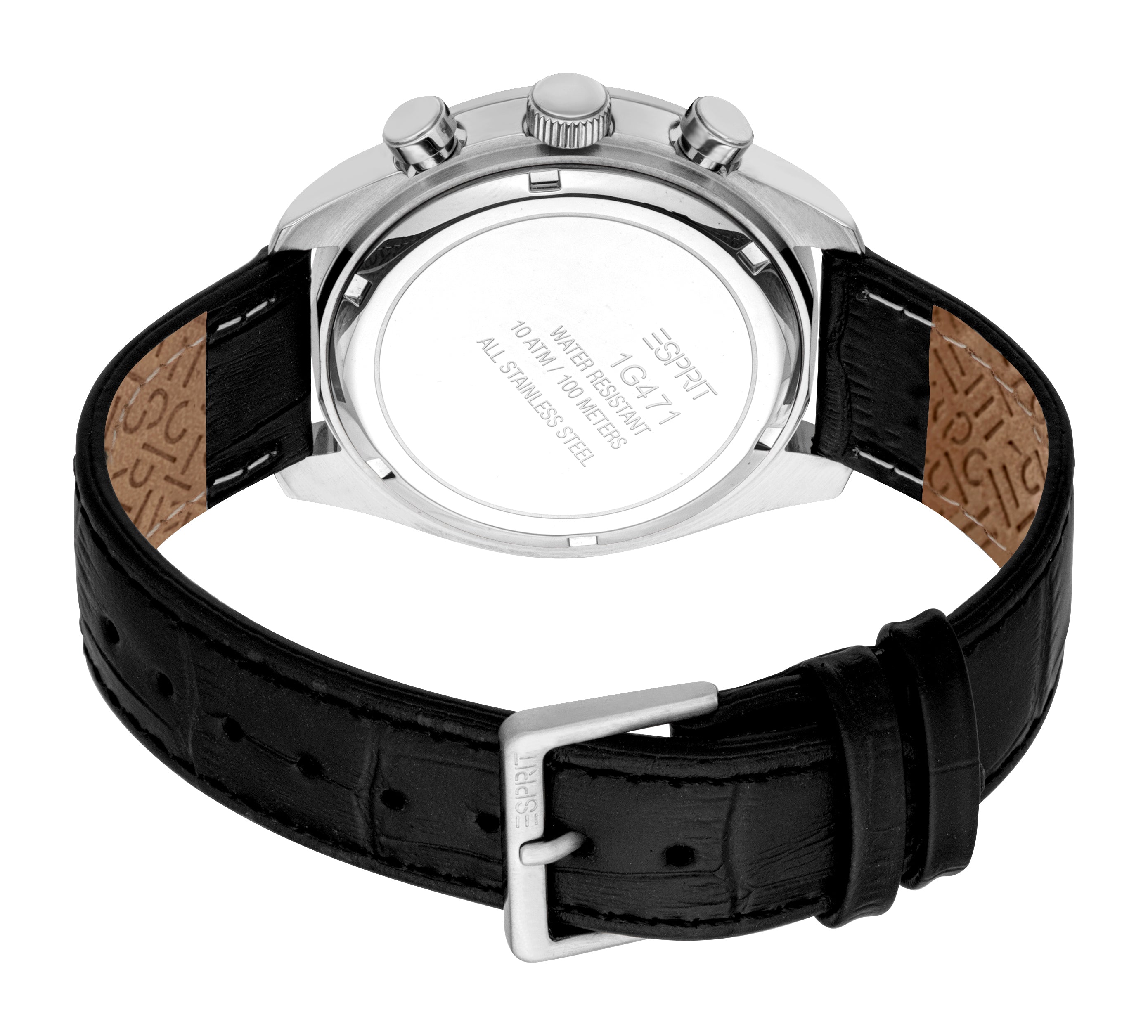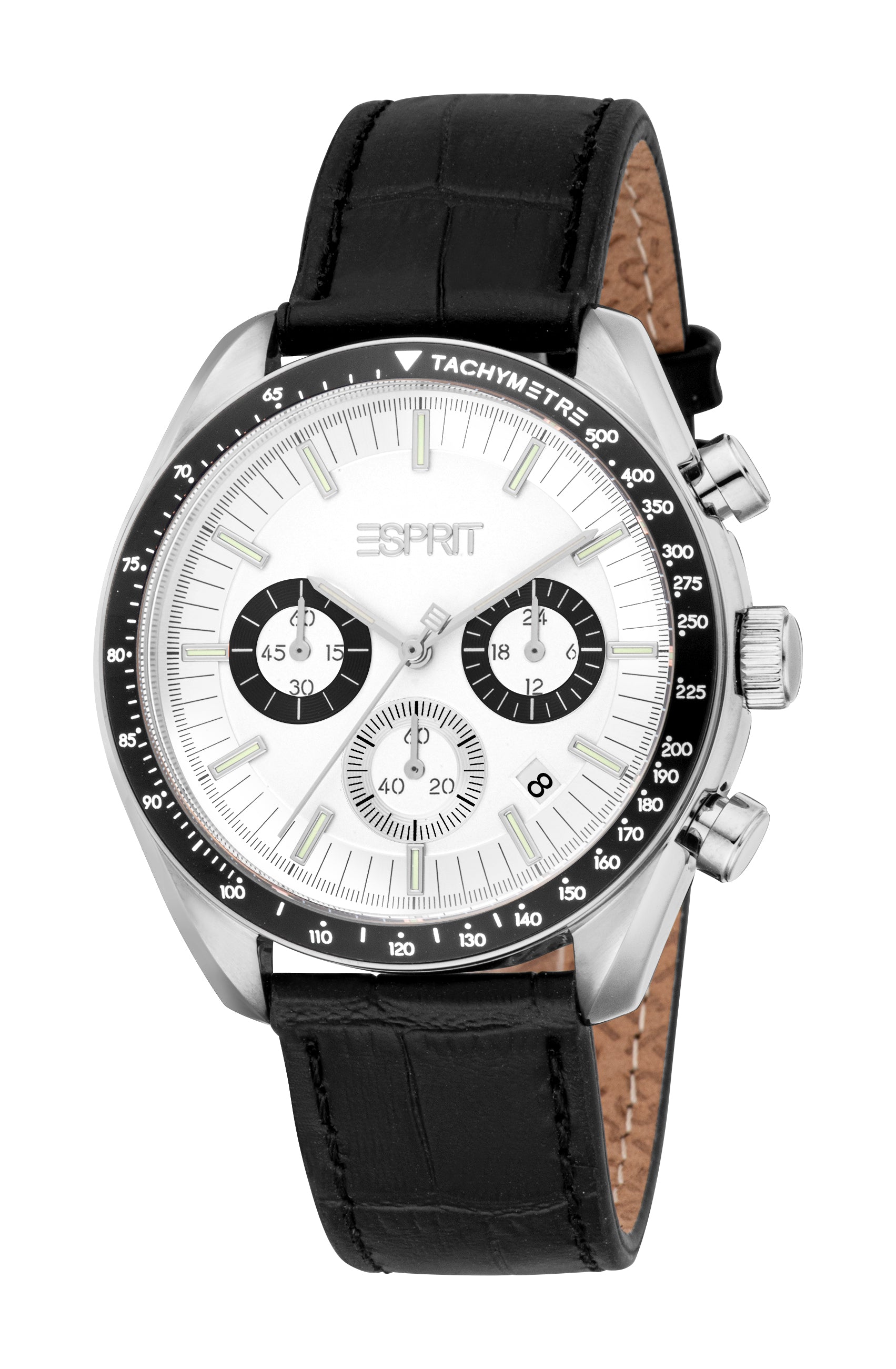Esprit Men’s Chronograph Black Leather Watch – Silver Case, Tachymeter, 10 ATM Water Resistant