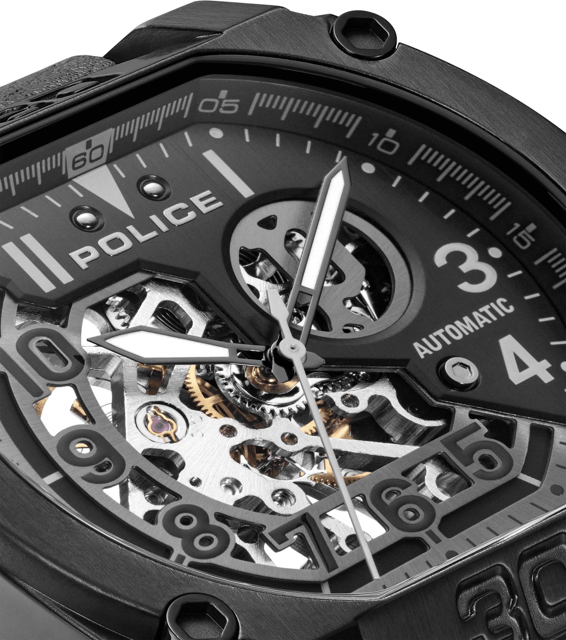 Police Norwood Automatic Gents Black Dial Black Leather Strap Watch