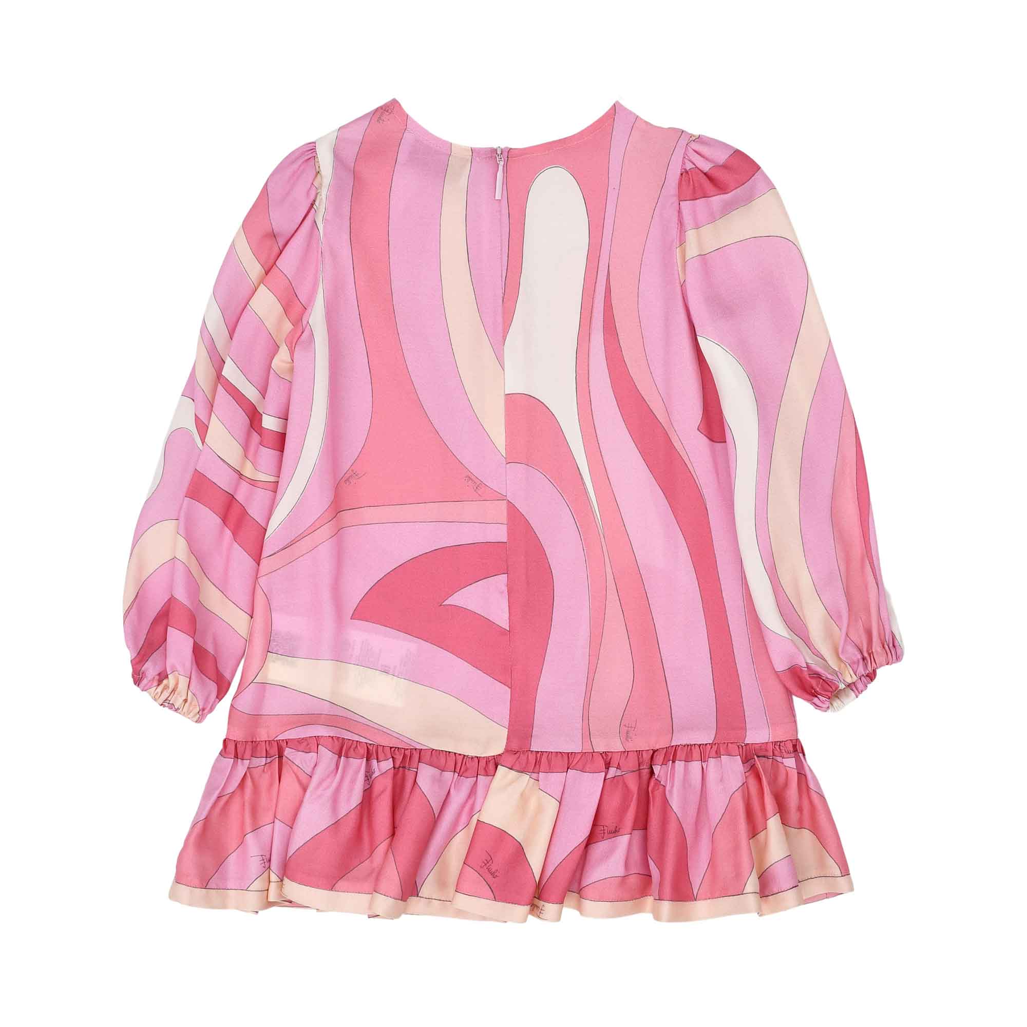 The Emilio Pucci Kids Baby Girl's Abstract Swirl Print Drop-Hem Dress is a standout piece, beautifully dominated by lively shades of fuchsia, pale pink, and white. Its iconic PUCCI abstract swirl or wave pattern instantly draws the eye, giving the dress a playful yet sophisticated appeal. Designed with a round neckline and long sleeves, the dress ensures comfort and style, while the gathered cuffs and lightly puffed shoulders add a touch of feminine charm. The silhouette is elevated by a tiered, ruffled drop-hem that falls gracefully to the knee, creating a sense of movement. For easy dressing, the dress features a convenient zip closure at the back, making it both practical and adorable for any special occasion.