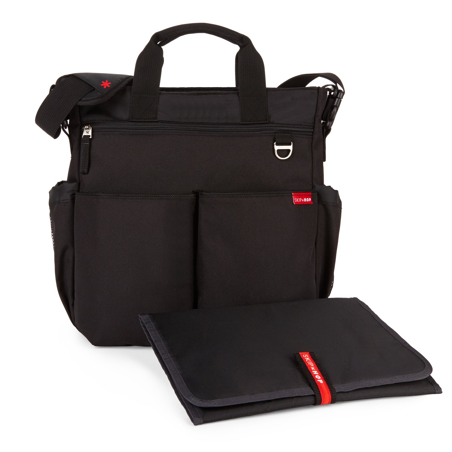 This versatile bag is designed with functionality and convenience in mind. The main compartment features a secure zip closure, providing ample storage space, while ten thoughtfully placed pockets help keep belongings organized. Two elasticized mesh side pockets comfortably fit most bottles, and the front zip pocket paired with an easy-access tech pocket ensures essentials are within reach. Equipped with grab handles and an adjustable shoulder strap featuring a slip-on shoulder pad, it offers comfortable carrying options. Vegan leather trim accents add a stylish touch to the Grey Melange and Soft Slate versions. Custom hardware includes a D-ring for attaching toys or a pacifier pocket, while the contrasting lining enhances visibility inside the bag. Patented shuttle clips and nonslip stroller straps make it easy to attach to strollers for on-the-go convenience. Additionally, the bag can hold tablets and laptops up to 15 inches, making it a perfect blend of style and practicality.