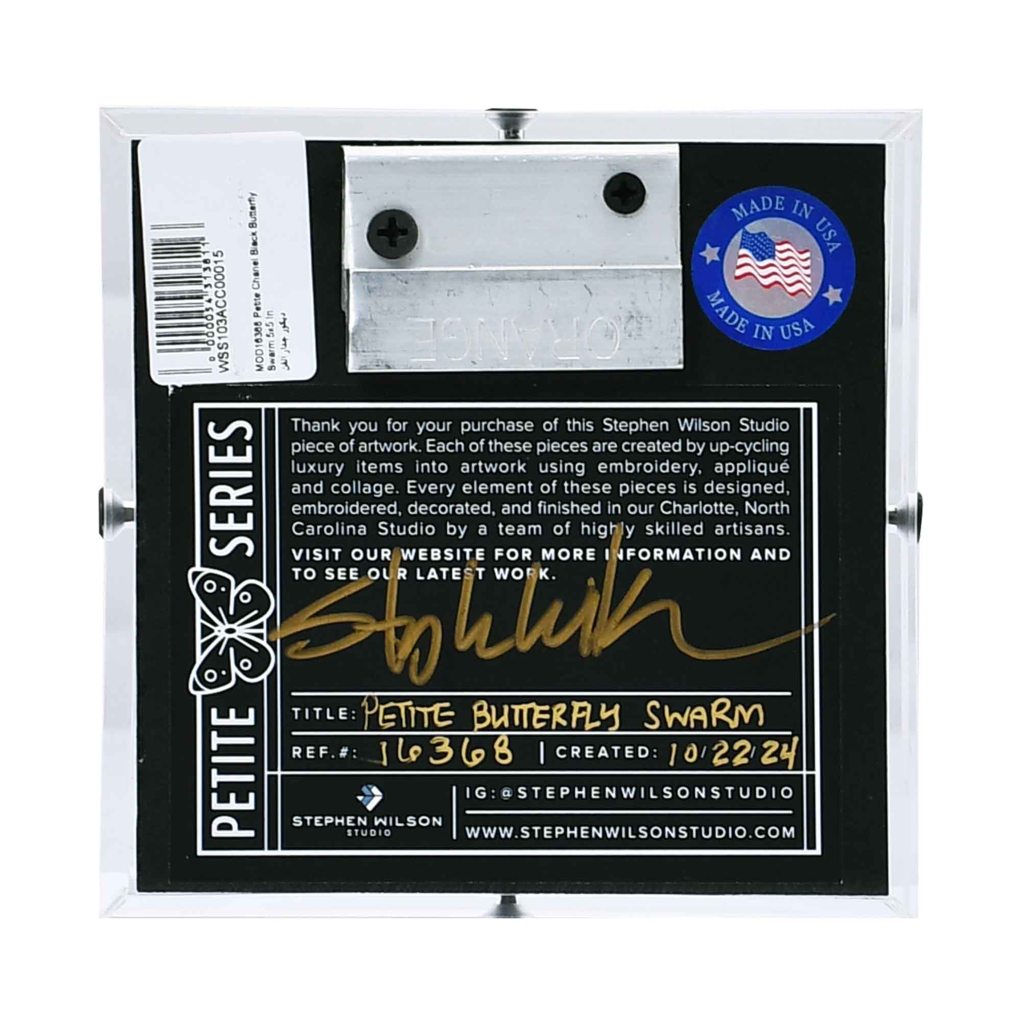 The Stephen Wilson Studio “Petite Butterfly Swarm Chanel” artwork transforms iconic Chanel elegance into a playful, uplifting art piece. Handcrafted from up-cycled luxury materials, this 5″ × 5″ collectible features vivid embroidered butterflies — a celebration of transformation and beauty — set against a deep black backdrop for striking contrast.
