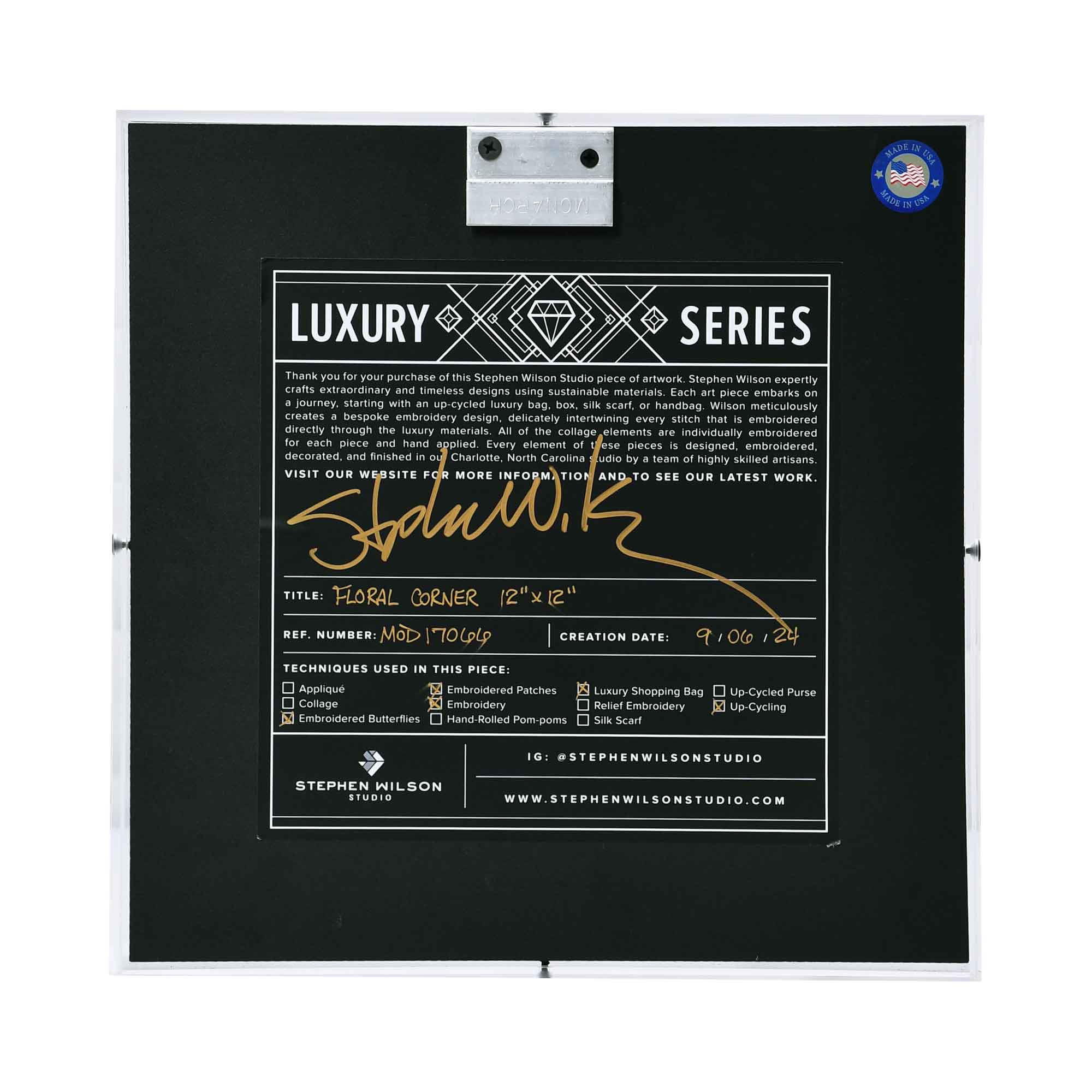 Celebrate color, craftsmanship, and couture artistry with the Stephen Wilson Studio Floral Corner Wall Art. This stunning 12x12-inch piece features hand-embroidered butterflies and vivid floral detailing over a genuine Gucci-inspired fabric backdrop. Each artwork is meticulously created in the USA using sustainable, upcycled luxury materials — making every piece a one-of-a-kind collectible that bridges fashion and fine art.
