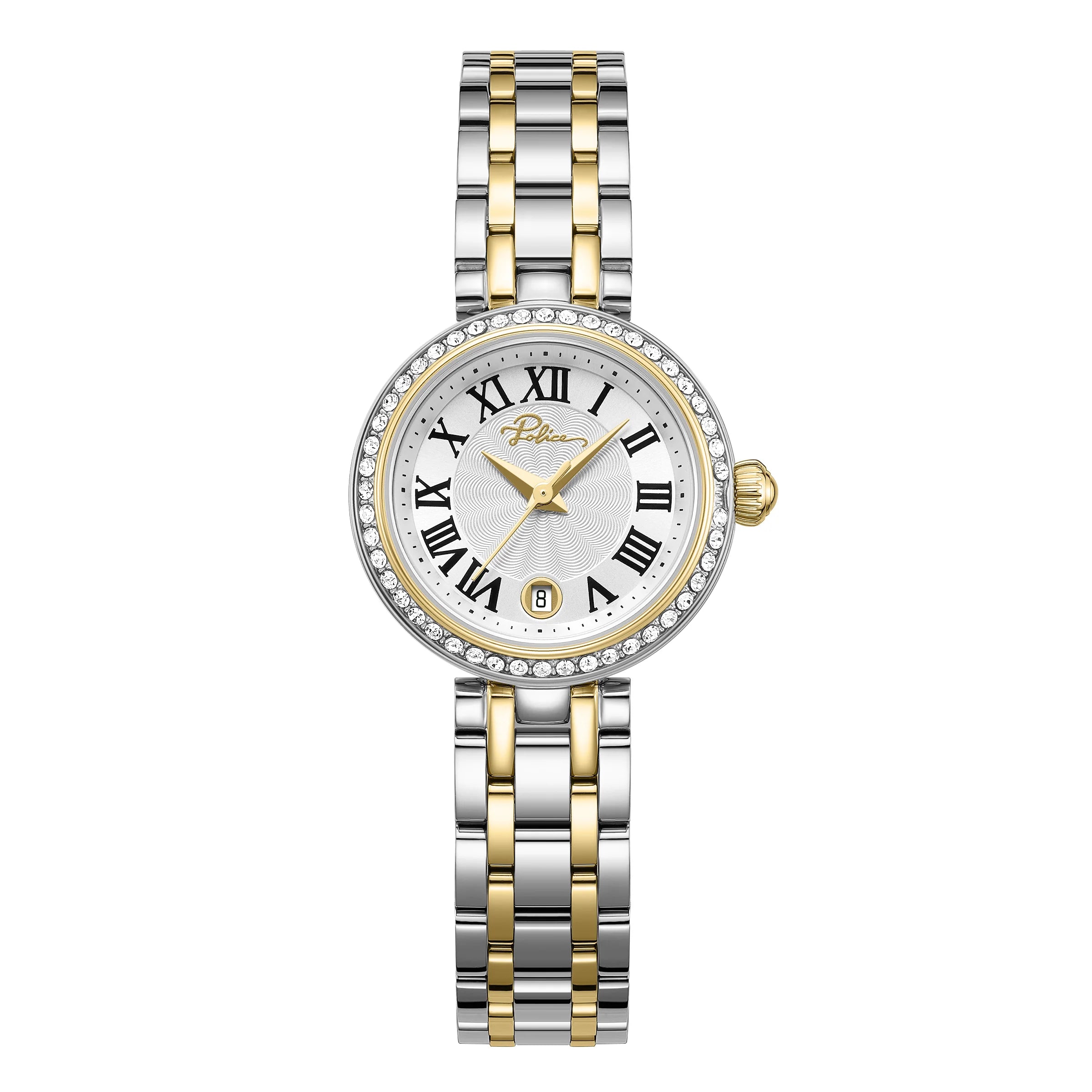 Police Denali Ladies Silver Dial Two-Tone Analog Watch with Roman Numerals & Crystal Bezel