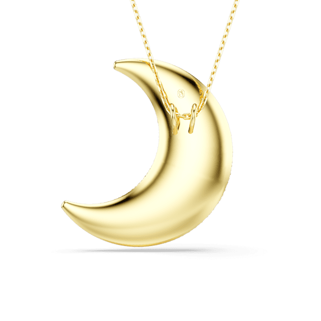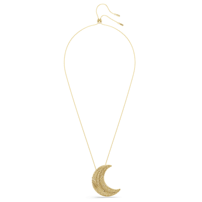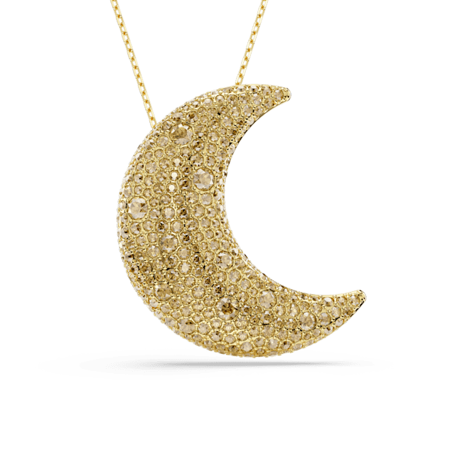 Swarovski sublima pendant Moon gold tone With this gold-toned pendant, you may gravitate your Ramadan style toward the moon. The gold-tone plated design consists of a single big crescent decorated with Golden Shadow crystals in five various sizes for a sophisticated pavé look. A stunning piece of jewelry to show off your mystical side, or a beautiful gift at a special time of year.