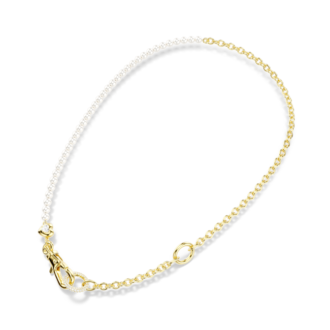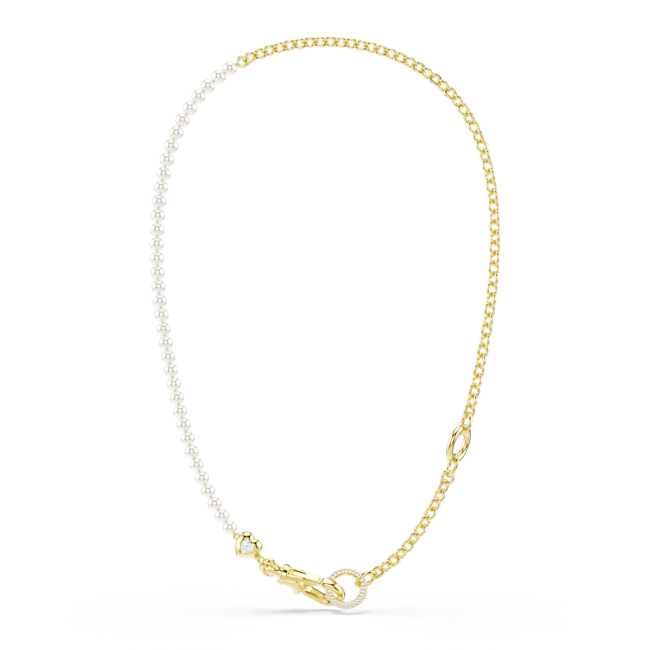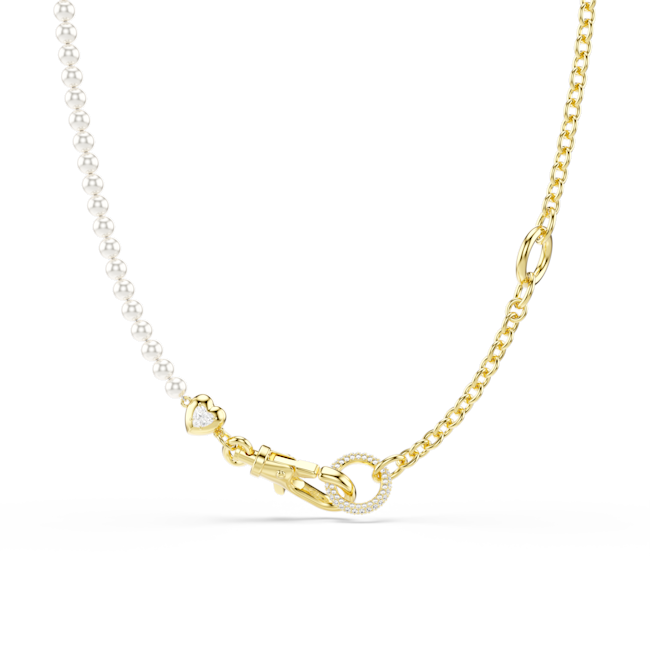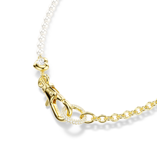 Split between a gold-tone plated chain and a row of white Swarovski Crystal Pearls, this necklace can be worn as a long all-around style, or in a Y-shape necklace by hooking the carabiner to the upper link. The small heart motif offers a subtle expression of love, while your own personality can be expressed through the addition of our Swarovski charms.