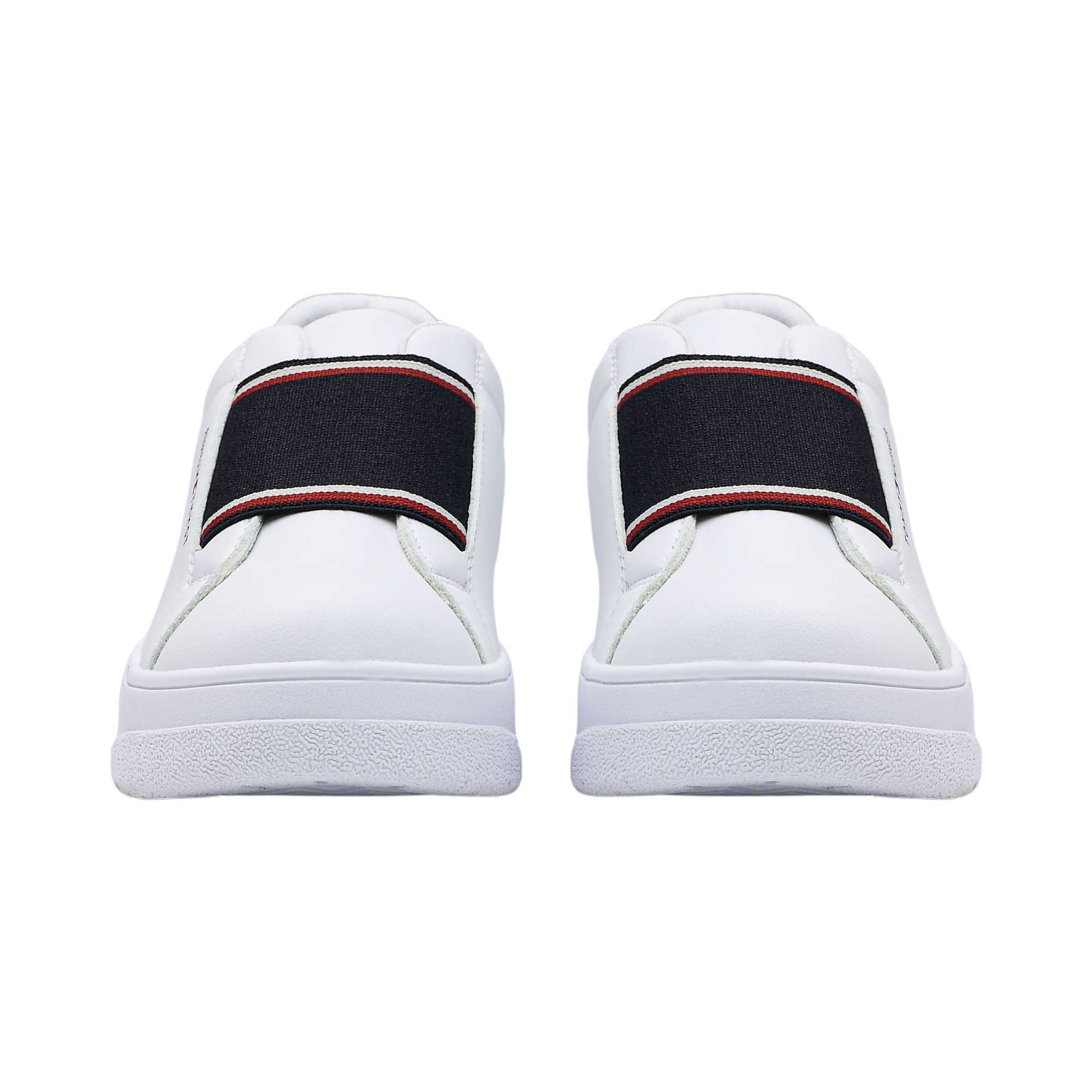 Slip on white faux leather trainers by Tommy Hilfiger. For instant brand recognition, they feature iconic flag branding woven within the elasticated panel on the front. They are lined with breathable cotton, and include a non slip sole which also features the red white and blue brand colors.