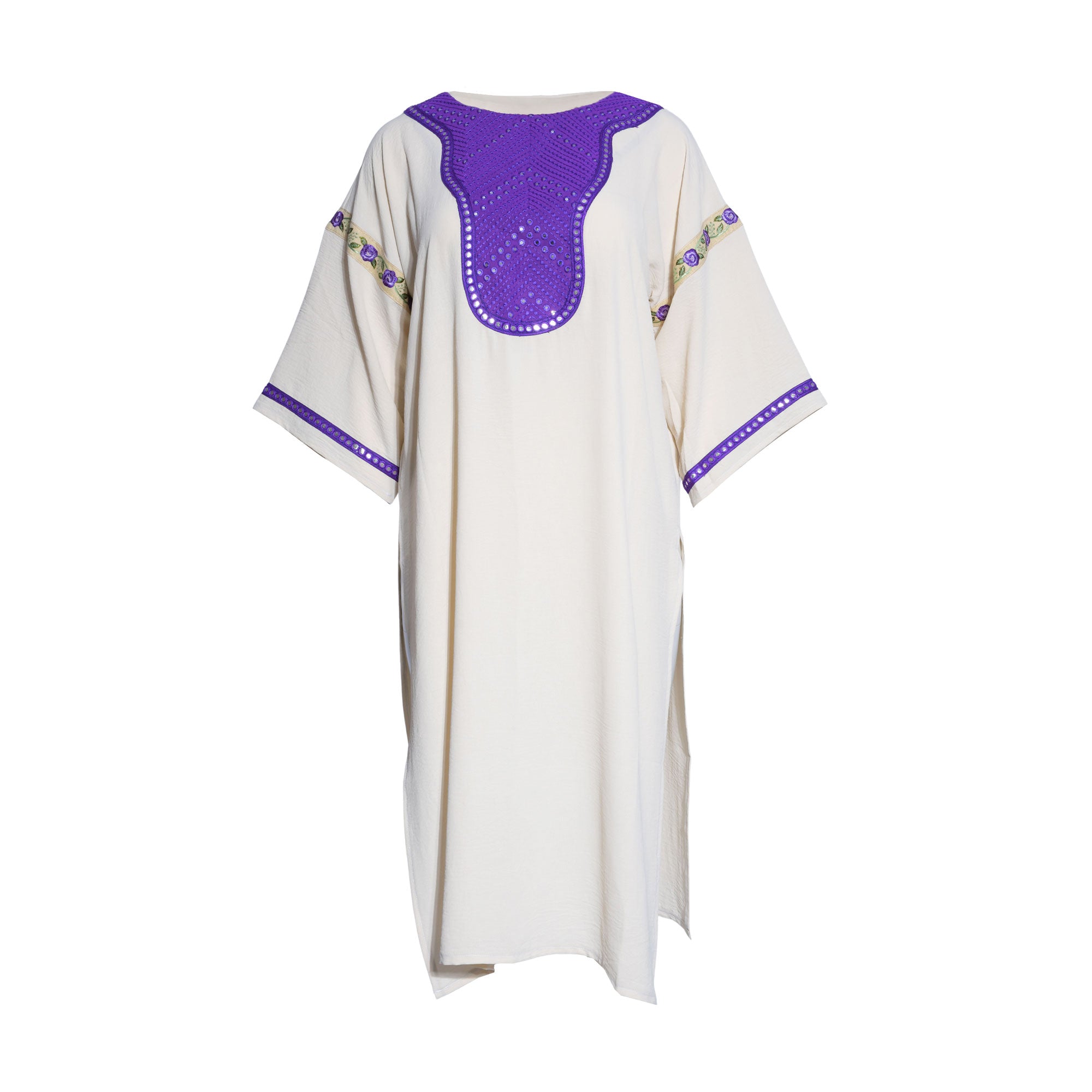 This Fahm Women's Purple & Green Dress is a stylish and versatile piece of clothing perfect for any occasion. With a free size fit and round neck design, this fashionable dress features long loose sleeves and mirror embroidery to the front, sleeves, and side slits. The unique combination of purple and green tones makes this an eye-catching piece of clothing. The dress is made with premium quality fabric for ultimate comfort and a flattering fit. It is breathable and lightweight, making it an ideal choice for wearing in any season. The mirror embroidery adds texture and contrast, while the side slits and round neckline allow for freedom of movement. The Fahm Women's Purple & Green Dress is a must-have for any fashionista's wardrobe. Whether you are looking to stand out in the crowd, or simply want to look and feel your best, this dress is sure to be a winning choice.