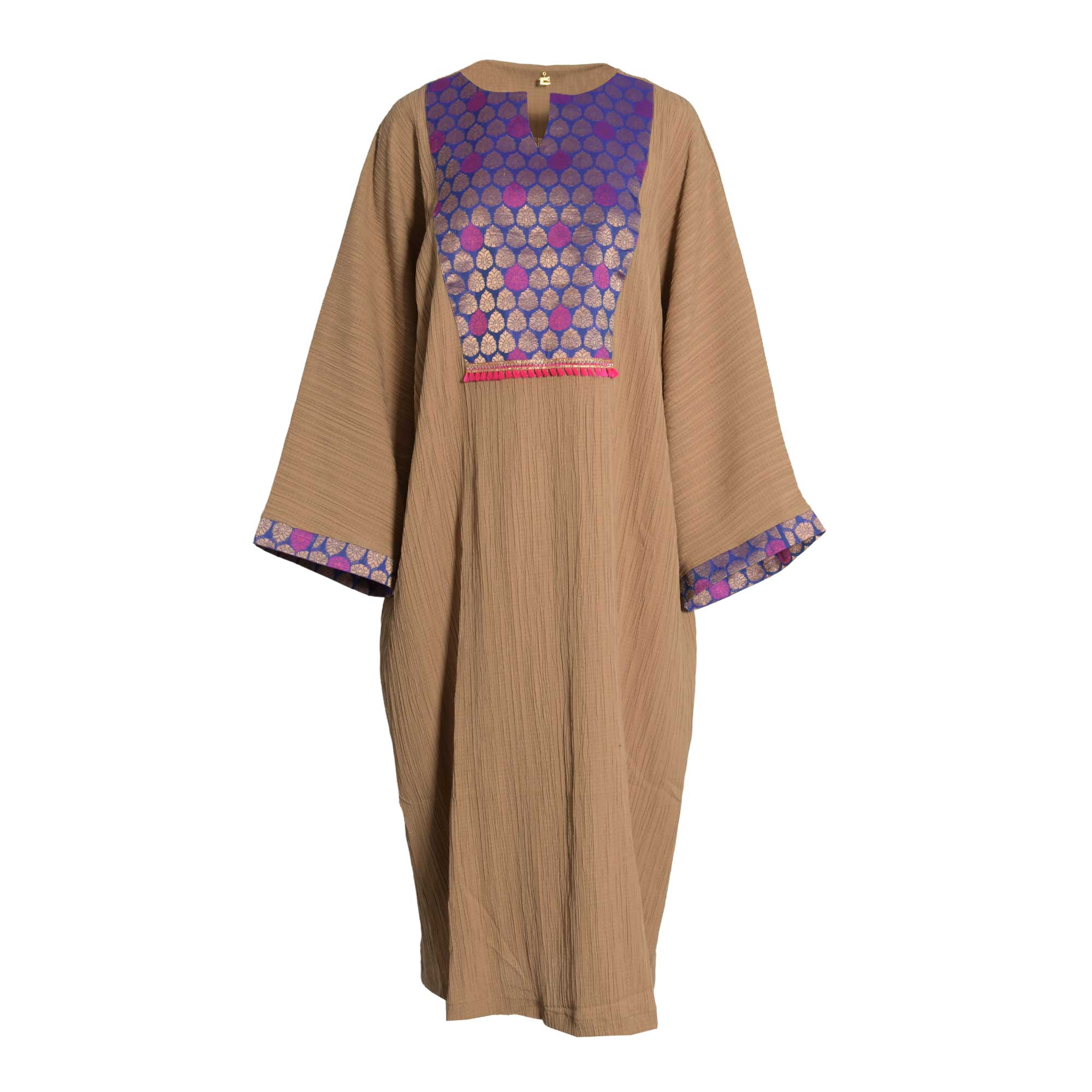 The Fahm Women's Brown & Printed Dress is a beautiful and unique piece of clothing. It has a round neck with a slit and long loose sleeves, giving it a casual and relaxed look. The fabric is a wrinkled fabric, which gives it a unique texture and look. The fabric is also very fine, making it comfortable and pleasant to wear. The dress is further enhanced by the beautiful multicolor fabric patch on the front and cuff, and a small tassel on the front. The dress is also available in Free Size, making it suitable for a variety of body shapes and sizes. This dress is perfect for any occasion, from a casual day out to a formal event. It is sure to make you look stylish and fashionable, and is guaranteed to turn heads wherever you go. SPECIFICATIONS: