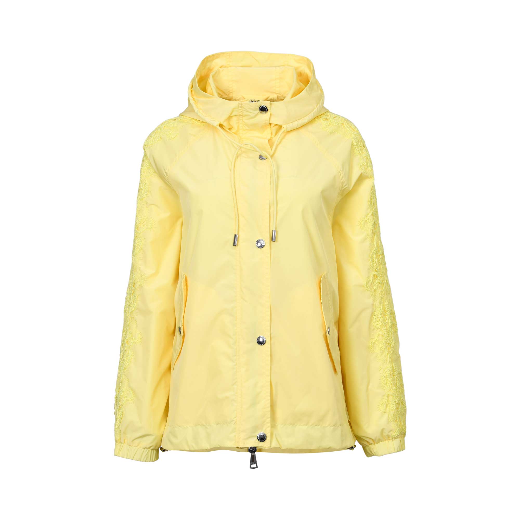 The Ermanno Firenze Women's Light Yellow Jacket is a stylish and functional outerwear piece, designed for both comfort and fashion-forward appeal. Crafted in a subtle light yellow hue, this jacket features a non-removable hood with an adjustable drawstring, offering added protection and a customizable fit for unpredictable weather. Practicality is enhanced with front pockets that include flaps and secure snap button closures, providing both utility and a touch of classic style. The front closure combines a sturdy zip with snap buttons for extra security and effortless wear. Long sleeves finished with elasticized wrists help keep out the chill, while tonal embroidery on the sleeves adds a refined, elegant detail that elevates the overall look. This jacket is ideal for those seeking a blend of everyday practicality and understated feminine flair.