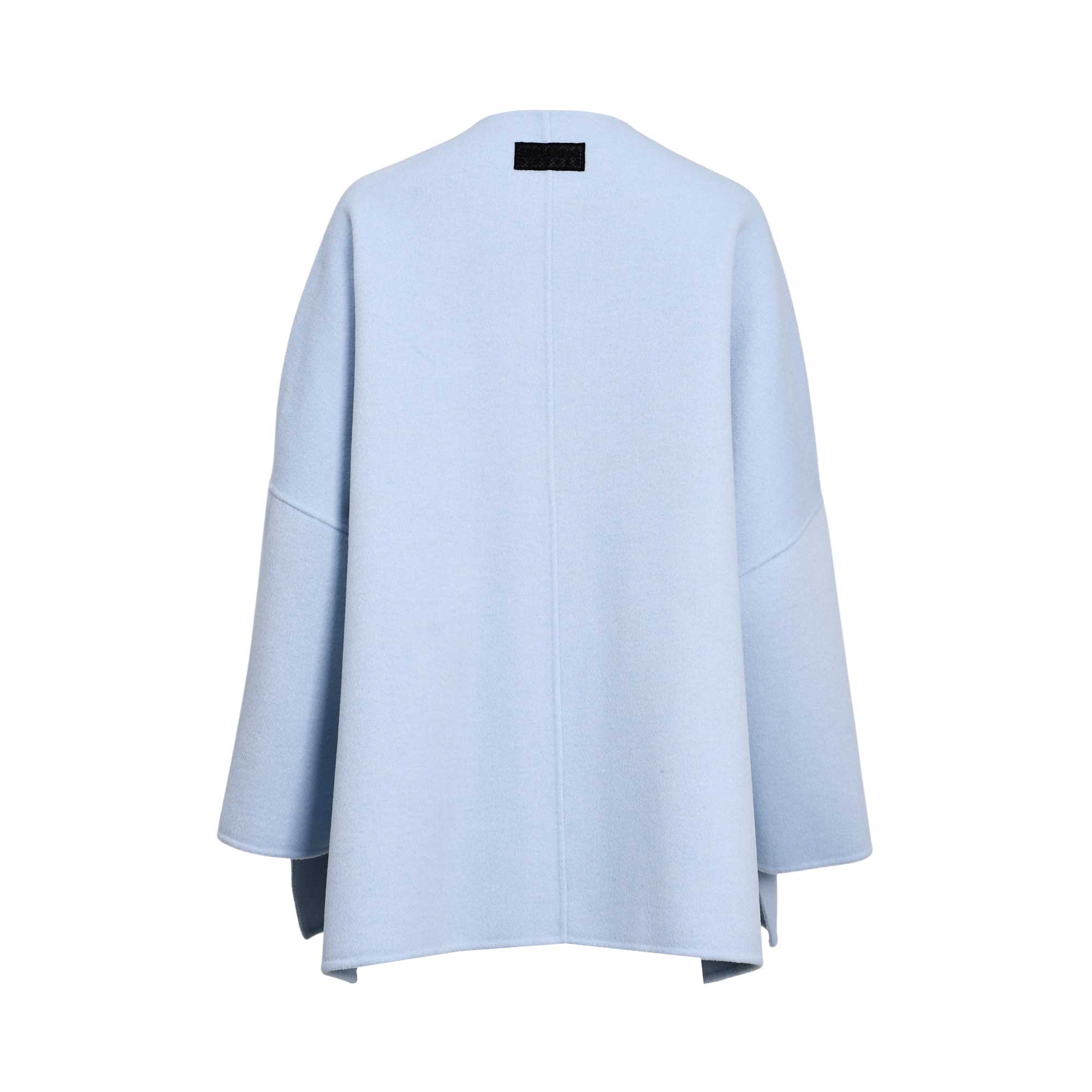 Color & Material: The garment is a soft, light sky blue or powder blue color. It appears to be made from a smooth, luxurious cashmere or wool blend.