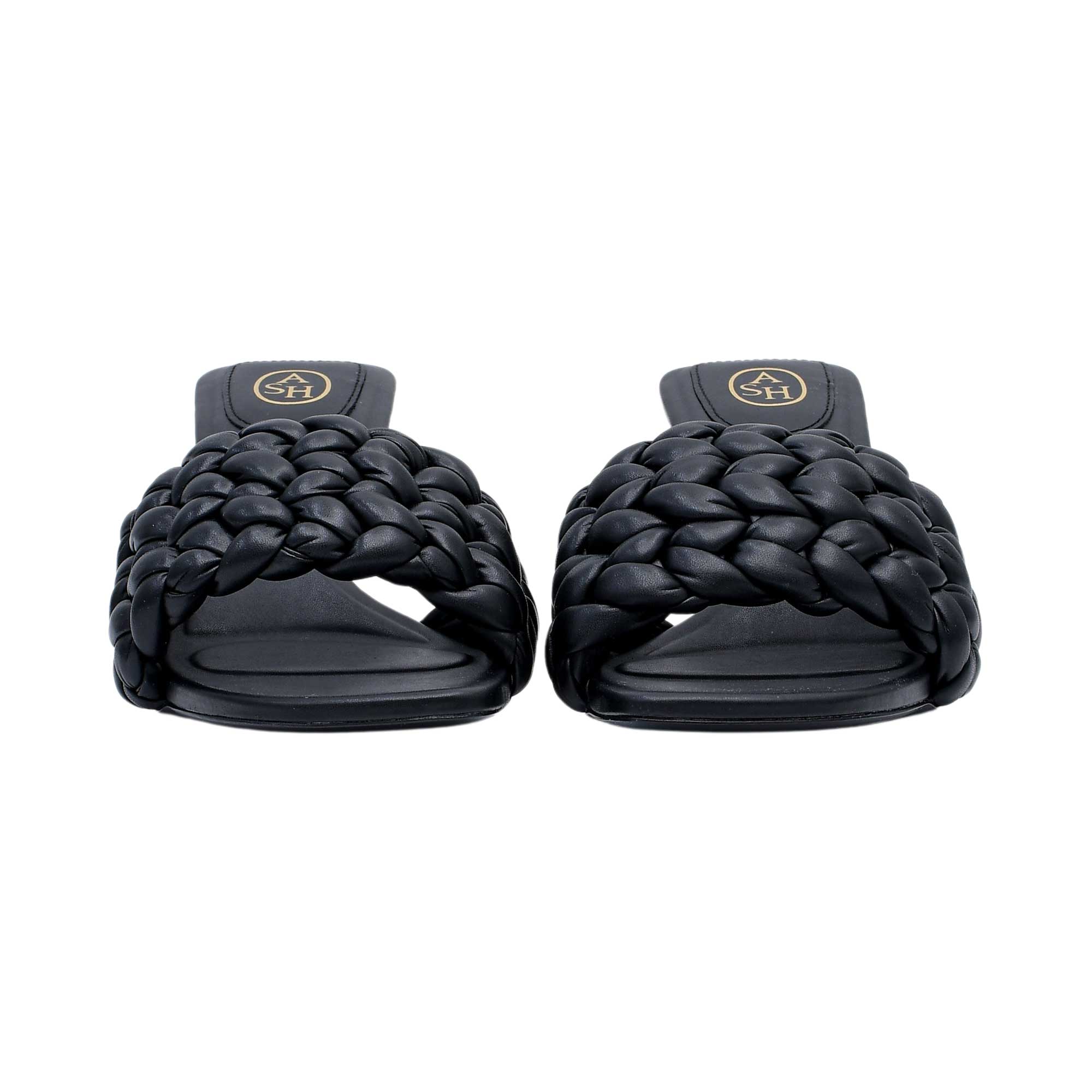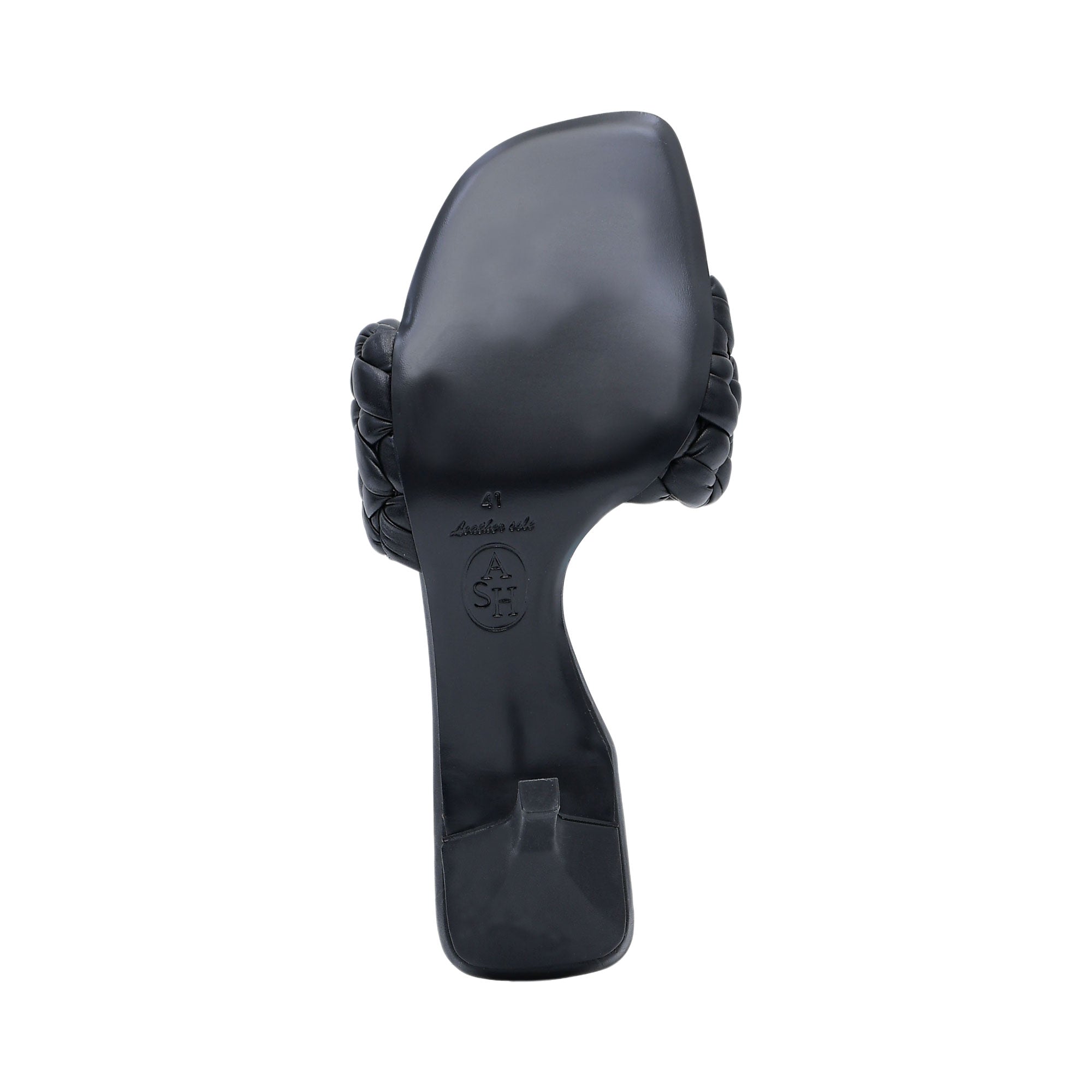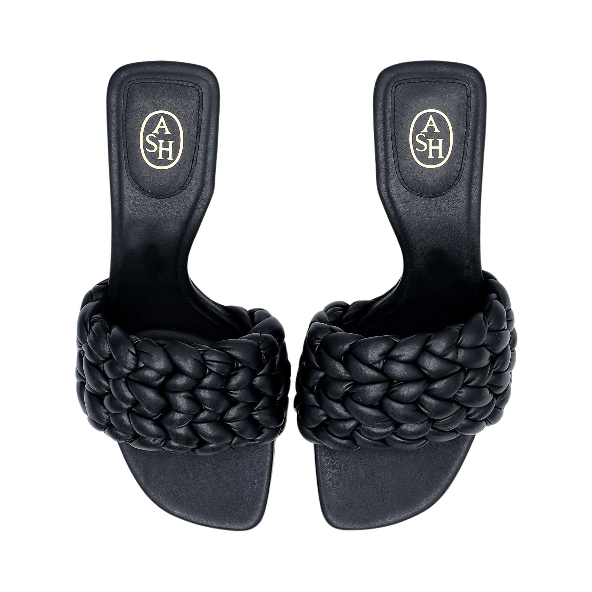 The ASH Women's Brasil Black Heel Sandal is a stylish and versatile shoe that combines comfort and sophistication. This sandal features a braided style and a square toe, giving it a unique and chic look. The slip on style makes it easy to put on and take off, making it perfect for everyday wear. The sandal is made of coated fabric, which gives it a sleek and polished appearance. It comes in a solid black color that can easily be paired with any outfit. The sandal is fully lined, providing extra comfort and support for the foot. It has a stiletto heel, adding height and elegance to the shoe. The leather sole gives the sandal a classic and luxurious touch. It is also important to note that this sandal contains non-textile parts of animal origin, adding to its high-quality materials. The ASH Women's Brasil Black Heel Sandal is a slide sandal, making it easy to slip on and off, perfect for on-the-go fashion. It is a versatile shoe that can be dressed up or down, making it suitable for any occasion.  Whether you're heading to work or going out for a night on the town, this sandal is a must-have in every woman's wardrobe.